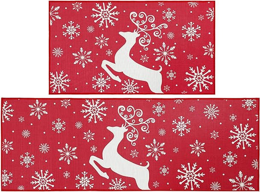 Non-Slip Decorative Xmas Holiday Snowflake and Christmas Deer Kitchen Mat 2 Pieces, 17"x29"+17"x47"