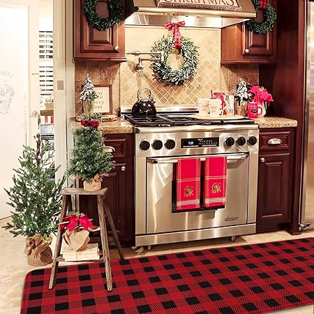 Non-Slip Washable Low-Profile Winter Xmas Buffalo Plaid Kitchen Mats Set of 2, 17"x47"+17" x30"
