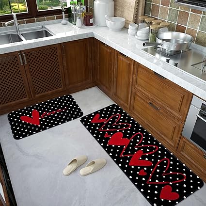 2 Pcs Valentines' Day, Black Kitchen Area Rug Set, Non Slip Backing, Absorbent Anti Fatigue Kitchen Mats