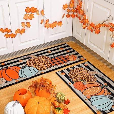 2 Pcs Thanksgiving Pumpkin Non Slip Seasonal Autumn Maple Leaves Striped Floor Mats, 17.7x29.5 and 17.7X 47.2 Inch