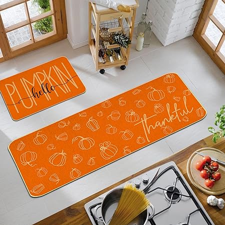 Orange Hello Pumpkin Thankful Fall Kitchen Mats Set of 2- 17x29 and 17x47 Inch