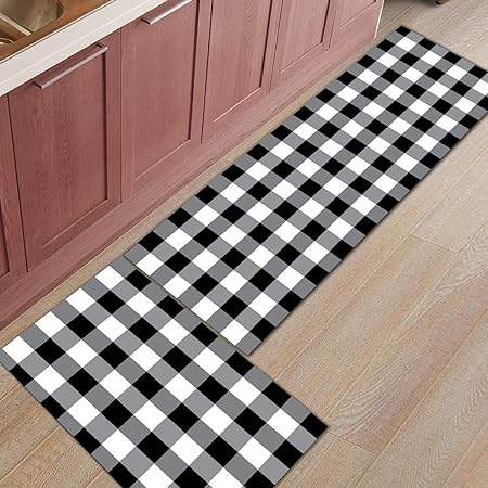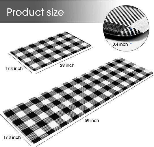 2 PCS Black and White Buffalo Plaid Cushioned Kitchen Rugs, 17"X48"+17"X24"