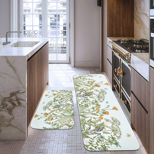 2 PCS Cushioned Floral, Flowers Anti Fatigue Kitchen Rugs - 18'' x 48'' + 18'' x 30''