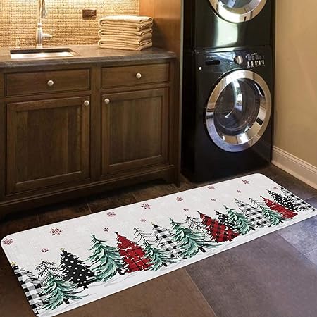 Set of 2 Anti-Fatigue Black and Green Gray Buffalo Xmas Tree Non-Slip Runner Rug, 16x24n+16x47in