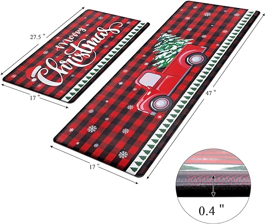 Set of 2 Anti-Fatigue Kitchen Mats Cushioned Red Plaid Christmas Truck Kitchen Rugs.17"x27.5"+17"x47"