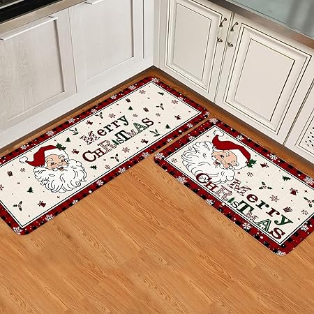 Set 2 Pieces Cute Santa Claus Decor Red Black Buffalo Plaid Non Slip Washable Kitchen Rugs, 15.7" x 23.6"+15.7" x 47.2"