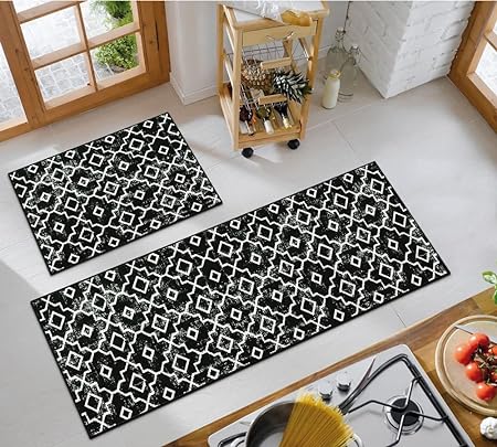 Set of 2, Geometric Washable Non Slip Waterproof Moroccan Black Rug for Kitchen Floor, 20x30+20x47
