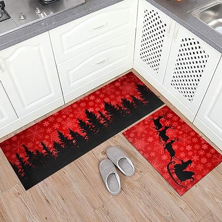 Set of 2 Non Slip Washable, 2 PCS Kitchen Rugs and Mats - 24"x16"+48"x16",Red