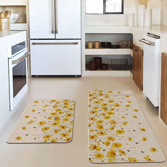 Set of 2, Yellow Flowers Bee Spring Summer Home Decor Low-Profile Kitchen Rugs 17x29 and 17x47 Inch