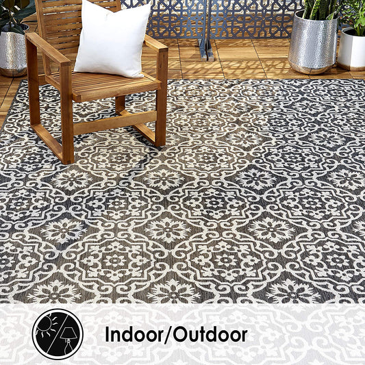 Damask Pattern Black Grey Indoor/Outdoor Area Rug - UV/Weather Resistant