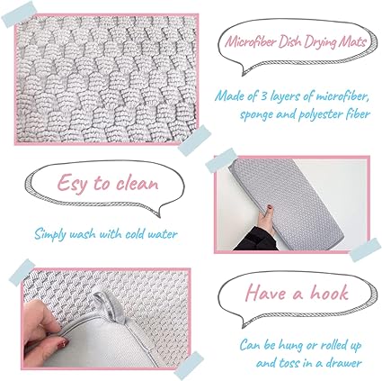 - Microfiber Drain pads are made of 3 layers of material, the thicker material is not only super absorbent, but also protects expensive tableware and marble countertops, which is very practica.