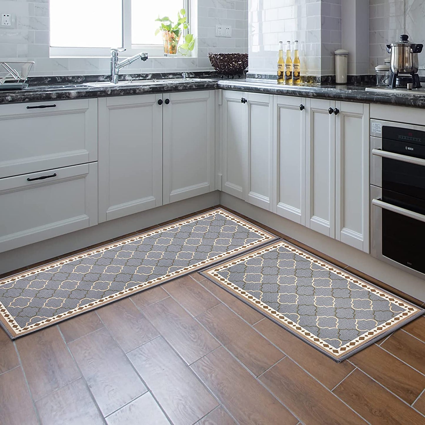 - 【Kitchen Rugs Set of 2】The unique design style kitchen mat set is made of high-quality microfiber, oil-proof, stain resistant, soft, and absorbent. The absorbent floor mats protect your floors from dirt and scratches and will not disintegrate or compress. This kitchen floor mat is scratch and break resistant. The back side is designed with non-slip points so the rug sticks to the floor and won't let people slip.