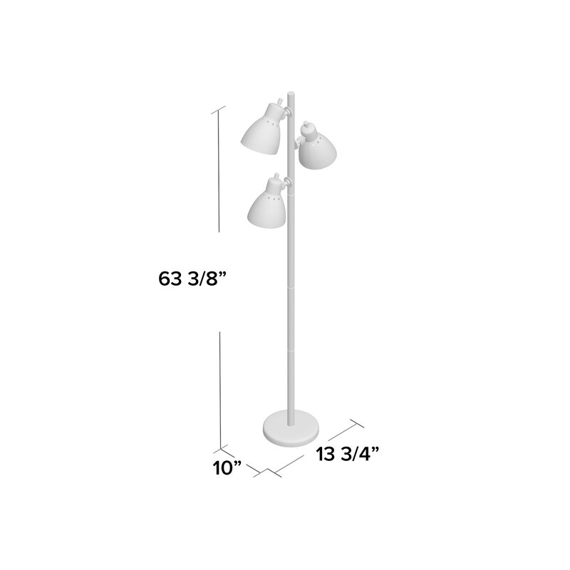 Illuminate your space in streamlined style with this 63" tree floor lamp. Crafted of iron in a contemporary finish, this lamp features a tall post on a round pedestal base. Lining the top of the post, three stylized cone-shaped shades ensconce 60 W incandescent E26 medium base bulbs (not included) to focus light downward and out, while hinged arms let your direct light where it’s needed most. Powered by a 72" cord length of cord, each light can be operated individually by a simple rotary switch.