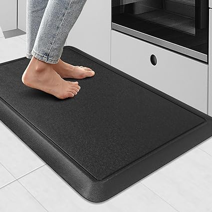 - [ANTI FATIGUE & COZY] The anti fatigue mats for kitchen floor are made out of 100% PVC material with a 1/2 inch thickness, this kitchen mat is soft & comfortable. The surface has a quick rebound and is ideal for wherever you may often stand for relief while you cook, work or clean. The anti fatigue mat is designed to relieve discomfort in the legs, back and lower back caused by long periods of standing.