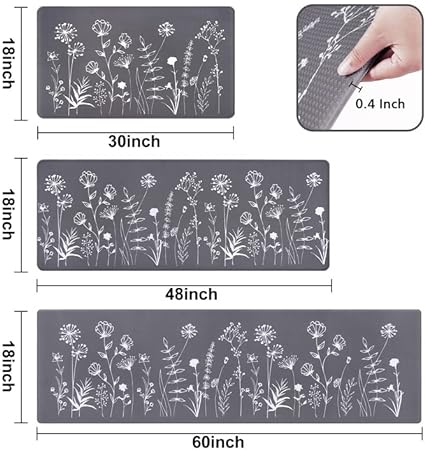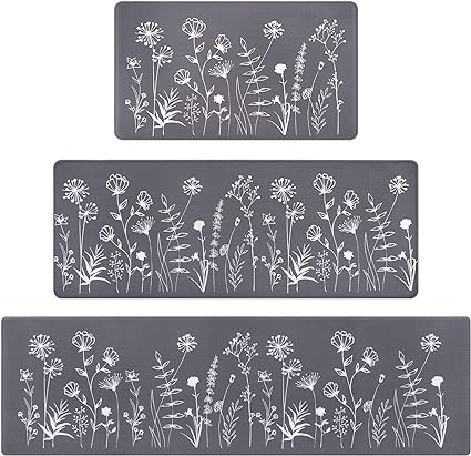 - 🌼EASY TO CLEAN: Our farmhouse flowers kitchen rug mat are easily cleaned. Simply clear dust on the mat with a vacuum cleaner or wipe stains with a damp cloth or sponge, and the grey mat will remain looking new. The cushioned anti fatigue kitchen mat will not fade or deform after repeated cleaning. High quality guarantees long-time durability. Make sure the floor is clean and dry before use.