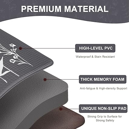 - 🌼PREMIUM MATERIAL & ANTI-SLIP: The non-skid waterproof kitchen mats and rugs have waterproof PVC surface and PVC foam backing. ​The surface has textured pattern, which enhances the anti-skid function, and the non-slip backing is helpful to keep the kitchen rug sturdy and prevent shifting or slipping, thus enhancing safety. The kitchen mats and rugs are made of superior material to ensure that the mats will keep their shape, even with extended and heavy use.