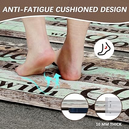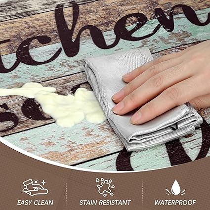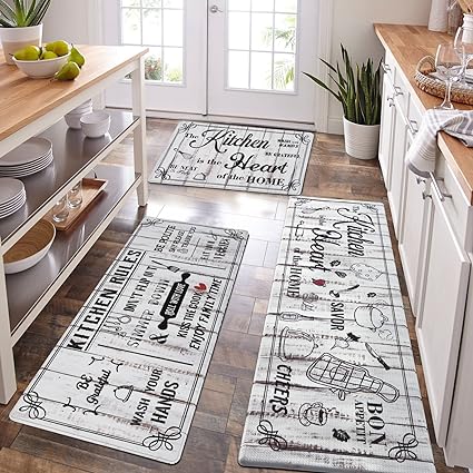 - 🌼VERSATILITY: Our comfort standing mat with runner works well on multiple surfaces (wood, ceramic, laminate, marble, concrete, etc), also making people feel good with cute design. The waterproof farmhouse kitchen mats sets 2 piece provide extra large surface area for standing in laundry room, kitchen, office, farmhouse, or in front of sink or any other high-traffic indoor or outdoor space.