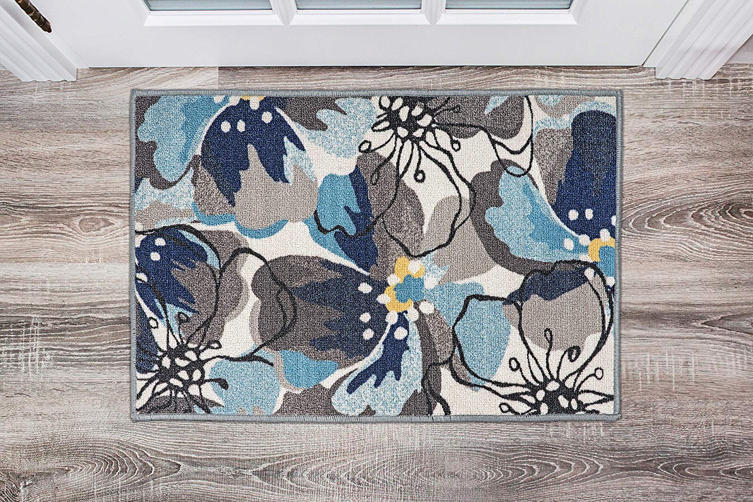 Blue Gray Ivory Floral Area Rug Non Slip/ No Skid - Low Pile