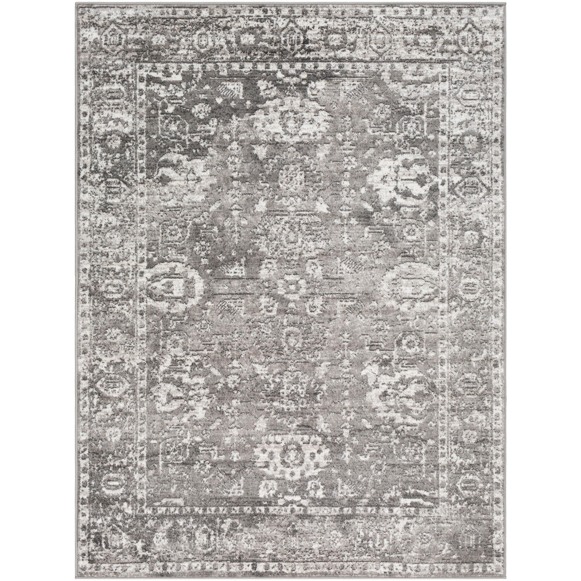 This lovely collection features a distressed traditional pattern in a beautiful blend of charcoal, light gray, and white. Gorgeous and soft, this rug features a comfortable pile with minimal shedding. Great for high-traffic areas. Machine made in Turkey with 100% polypropylene. Spot or professionally clean only. Rug pad recommended.