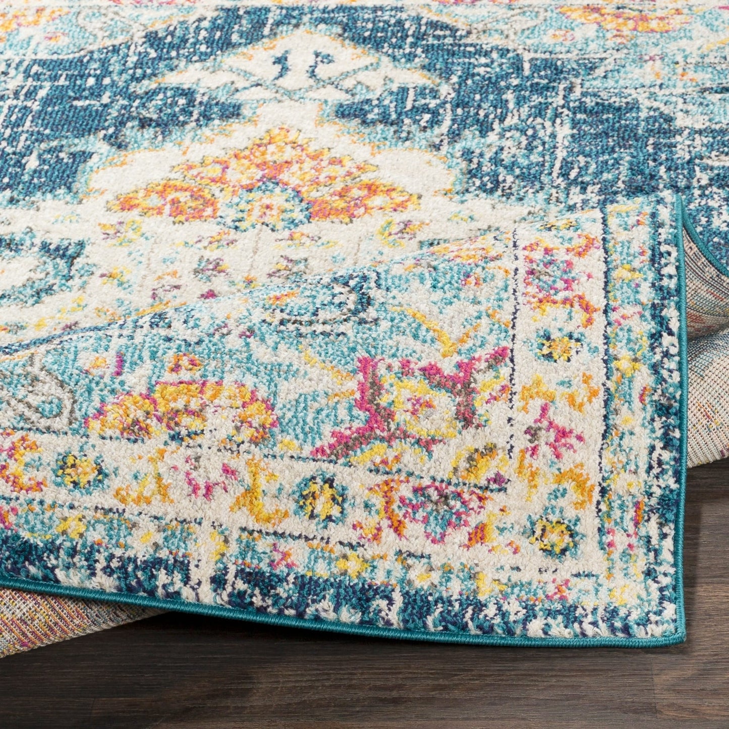 This vibrant collection features a distressed Bohemian pattern in a beautiful blend of teal, pale blue, beige, white, camel, gray, yellow, fuchsia, and coral. Gorgeous and soft, this rug features a comfortable pile with minimal shedding. Great for high-traffic areas. Provides a burst of color at an excellent price! Machine made in Turkey with 100% polypropylene. Spot or professionally clean only. Rug pad recommended.