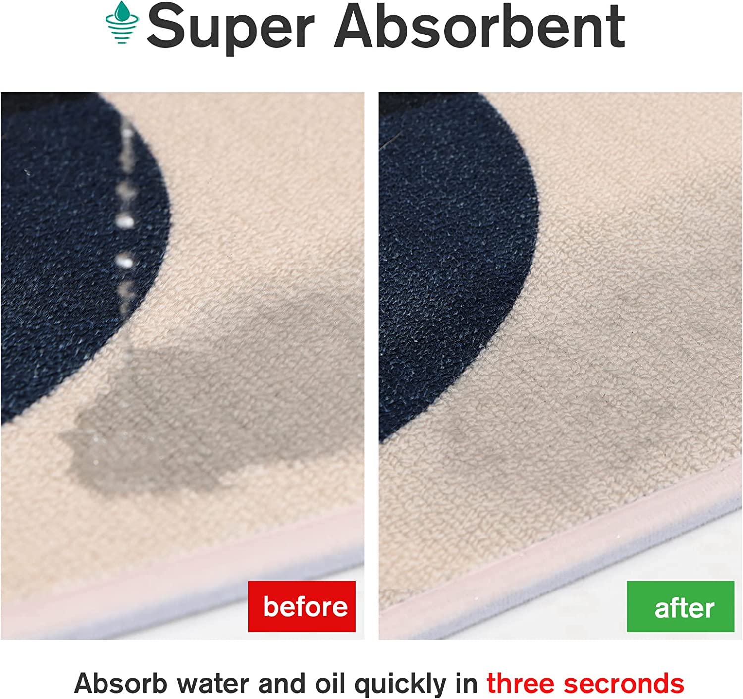 - Super Absorbent:The kitchen mat is super absorbent and perfectly absorbs water, oil, sauce or food residue during cooking, keeping the kitchen floor clean and tidy for a long time. It performs very well as a kitchen sink mat or laundry room mat.