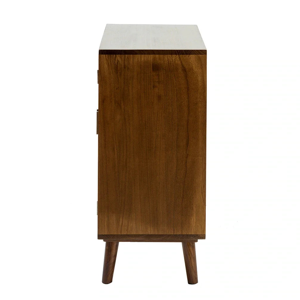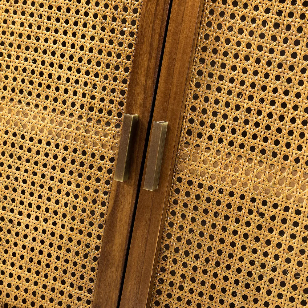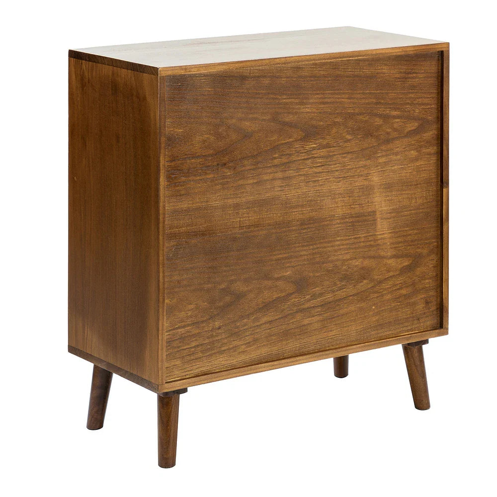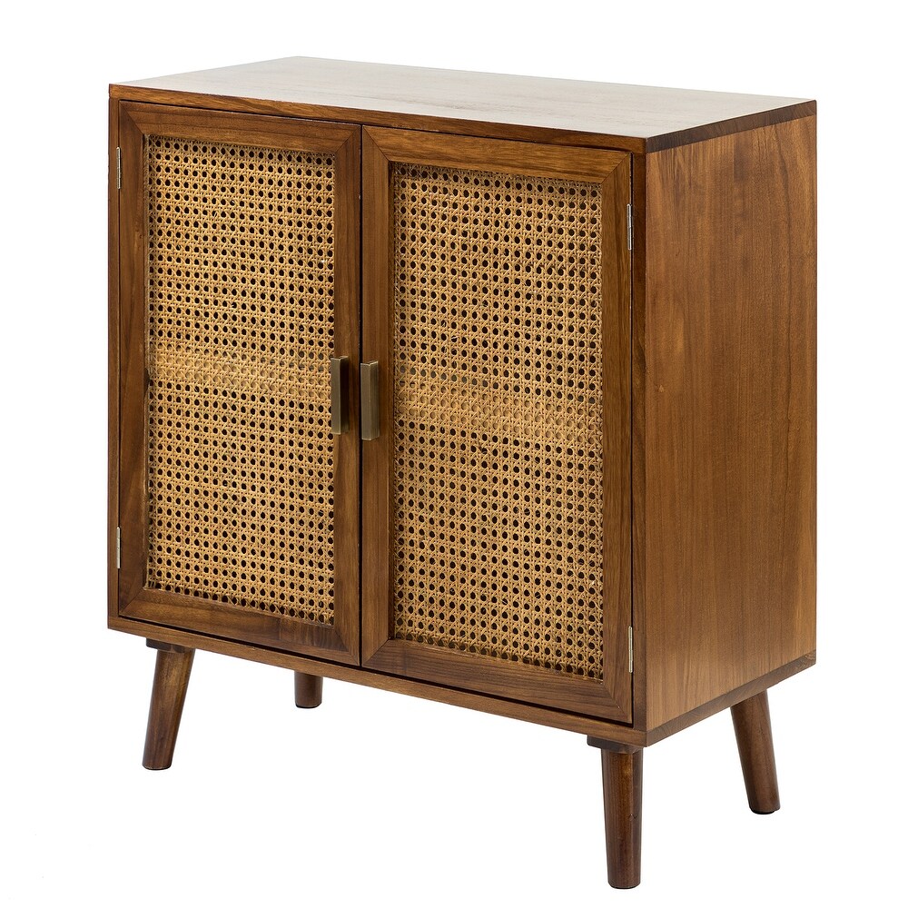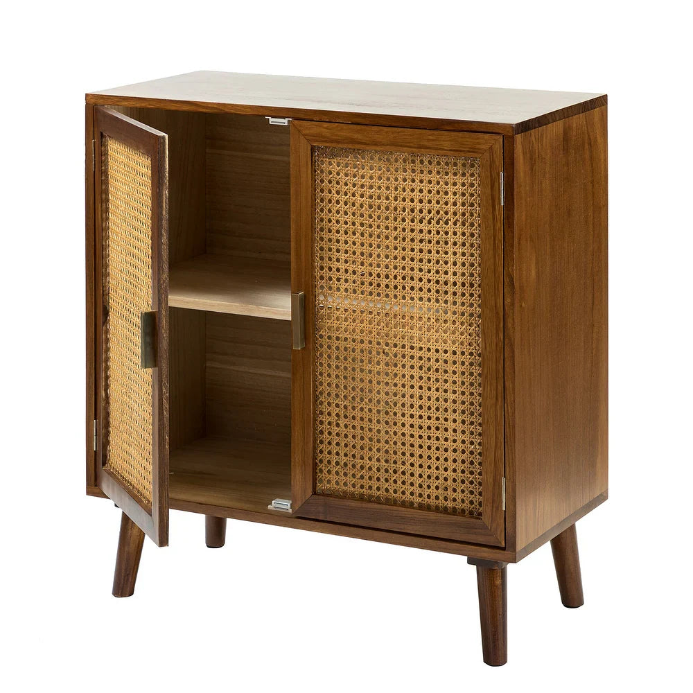 Looking for an elegant and practical way to keep your space organized? Look no further than the Borsippa 2-Door Accent Cabinet with Shelves. This cabinet is constructed of solid wood with a classic finish and features double rattan doors with metal edge pulls that open up to reveal a hidden storage area with two spacious shelves, making it perfect for any room in your home. The stable wooden frame stands atop four legs, ensuring long-lasting durability and stability. This versatile and functional piece will blend perfectly with any home decor style, allowing you to create the perfect storage options for your living room, dining room, or bedroom.