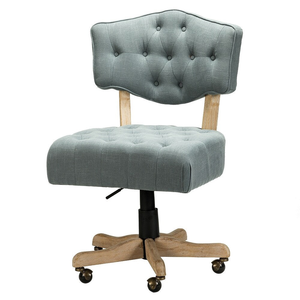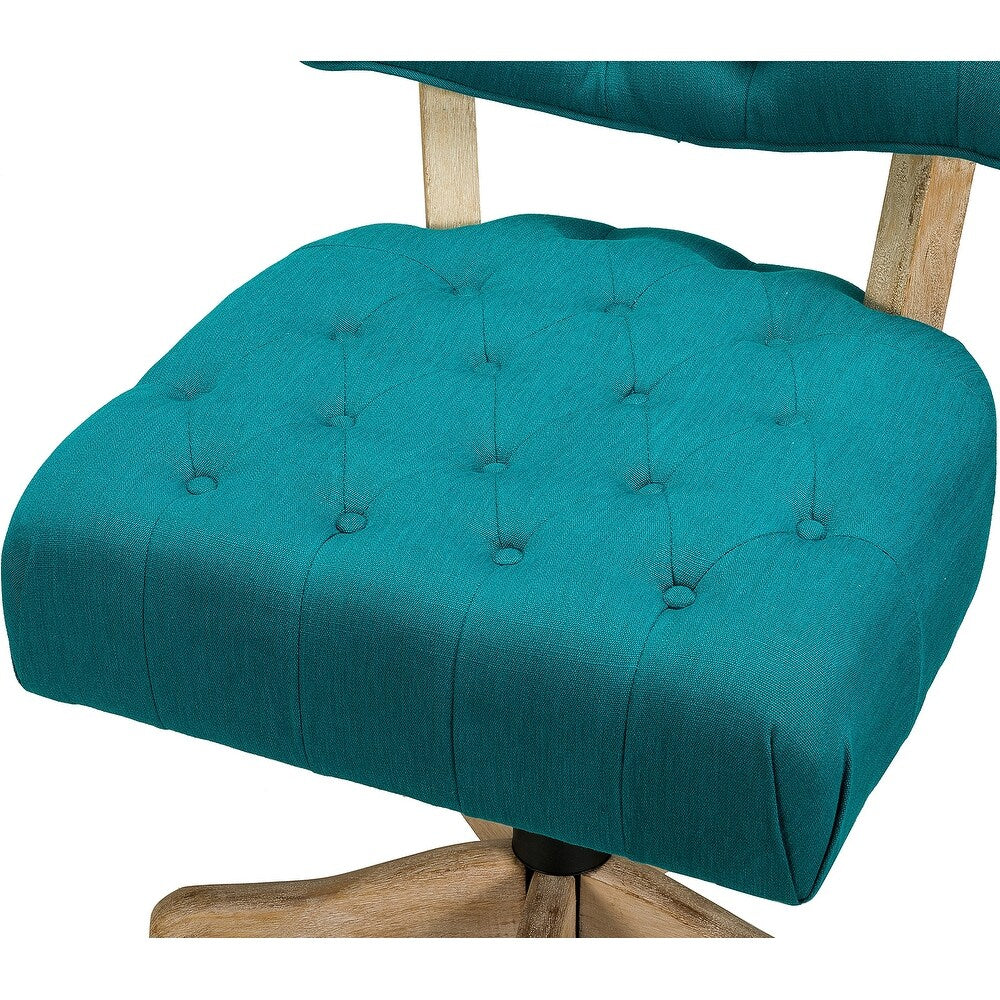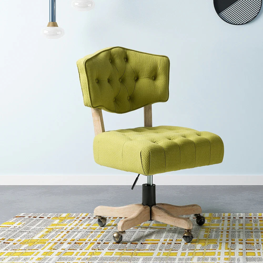 This Office Chair brings any workspace to life, from its rustic wood trimmed accents to its upholstery, this chair will make any workspace more stylish. It offers supreme comfort thanks to its ergonomic shape and features a durable frame with soft filling. The bright and colorful finish will blend with most color palettes. Durable solid wood five-pronged base and high performance all directional wheels allow smooth movement across carpeting. Button-tufted design dot the back and seat for a touch of texture.