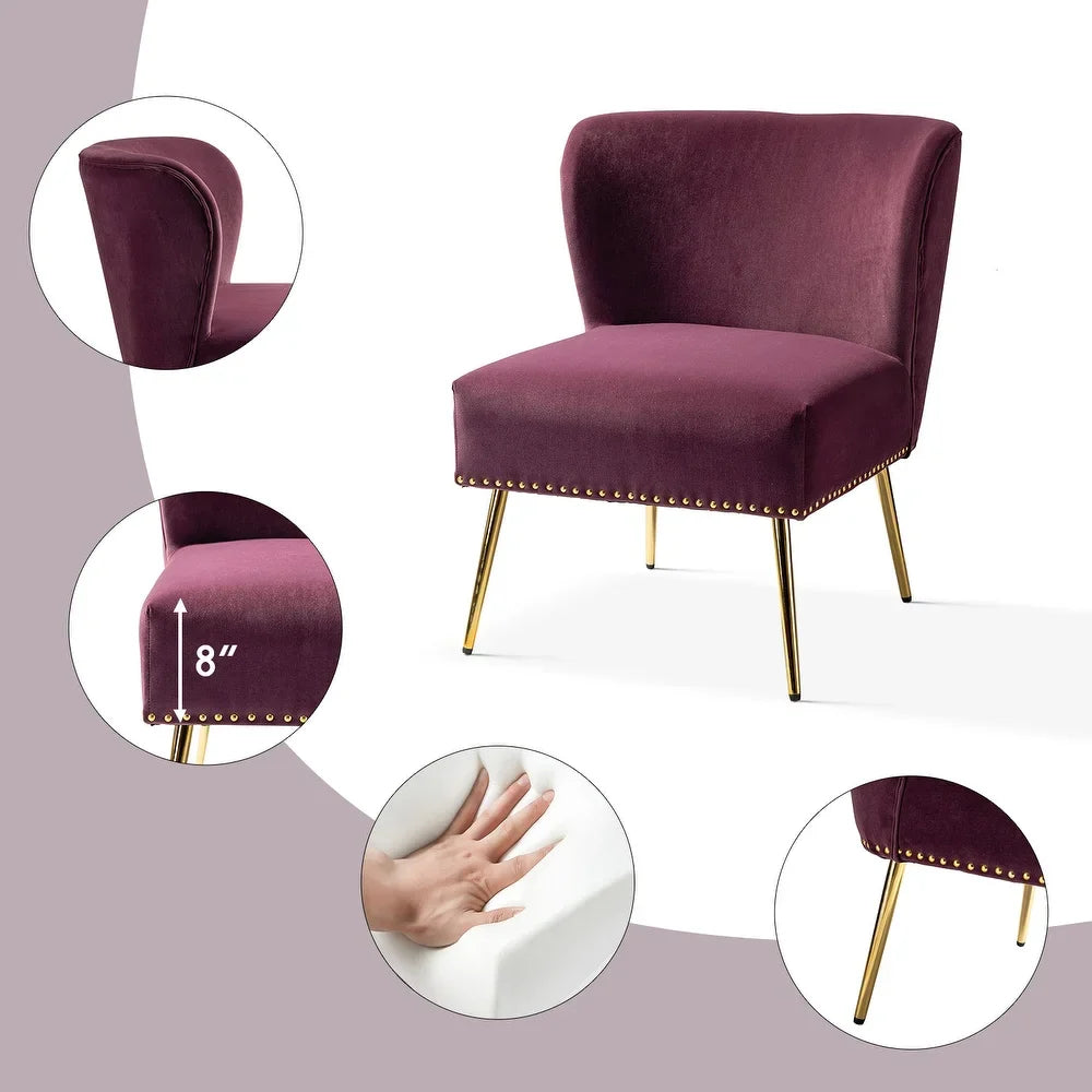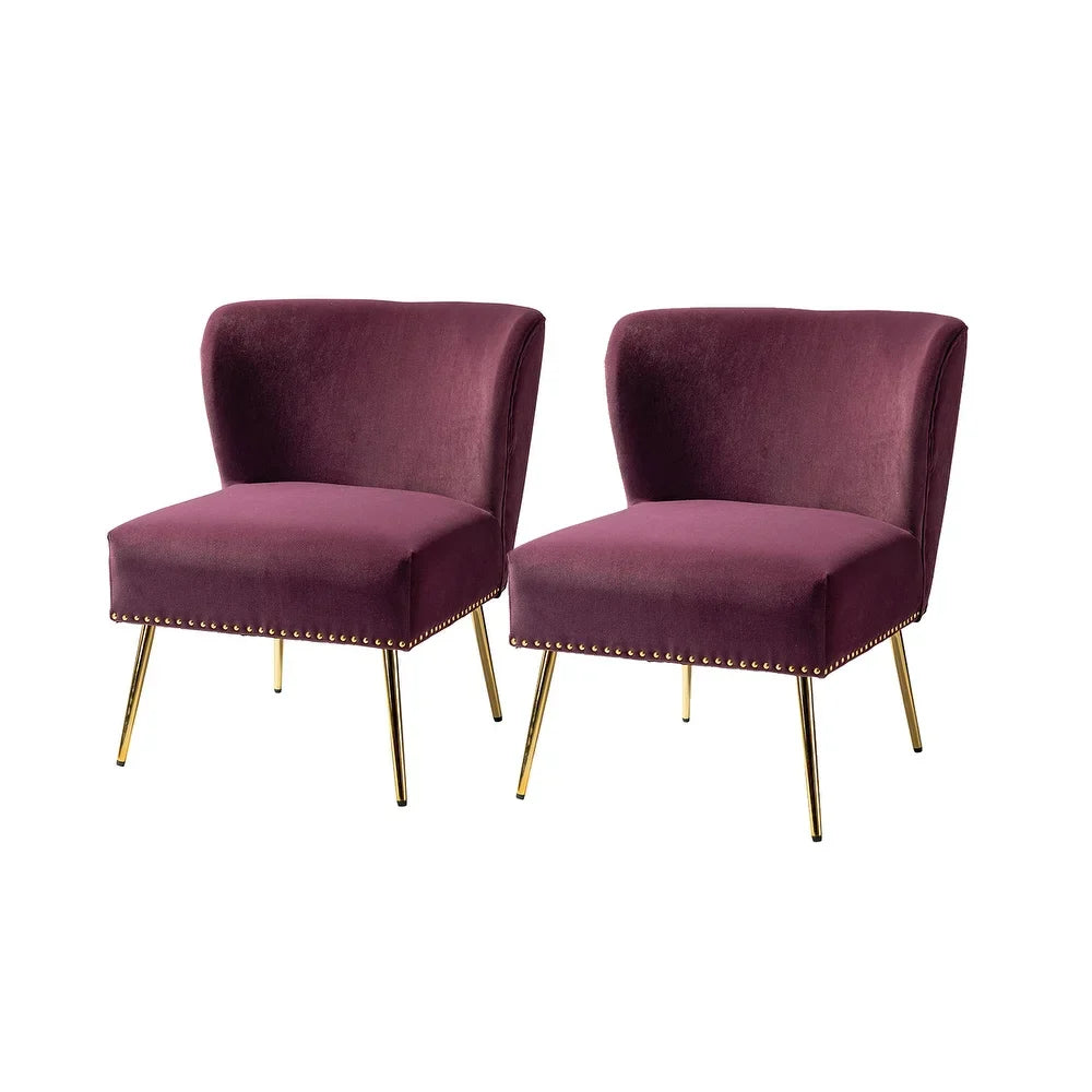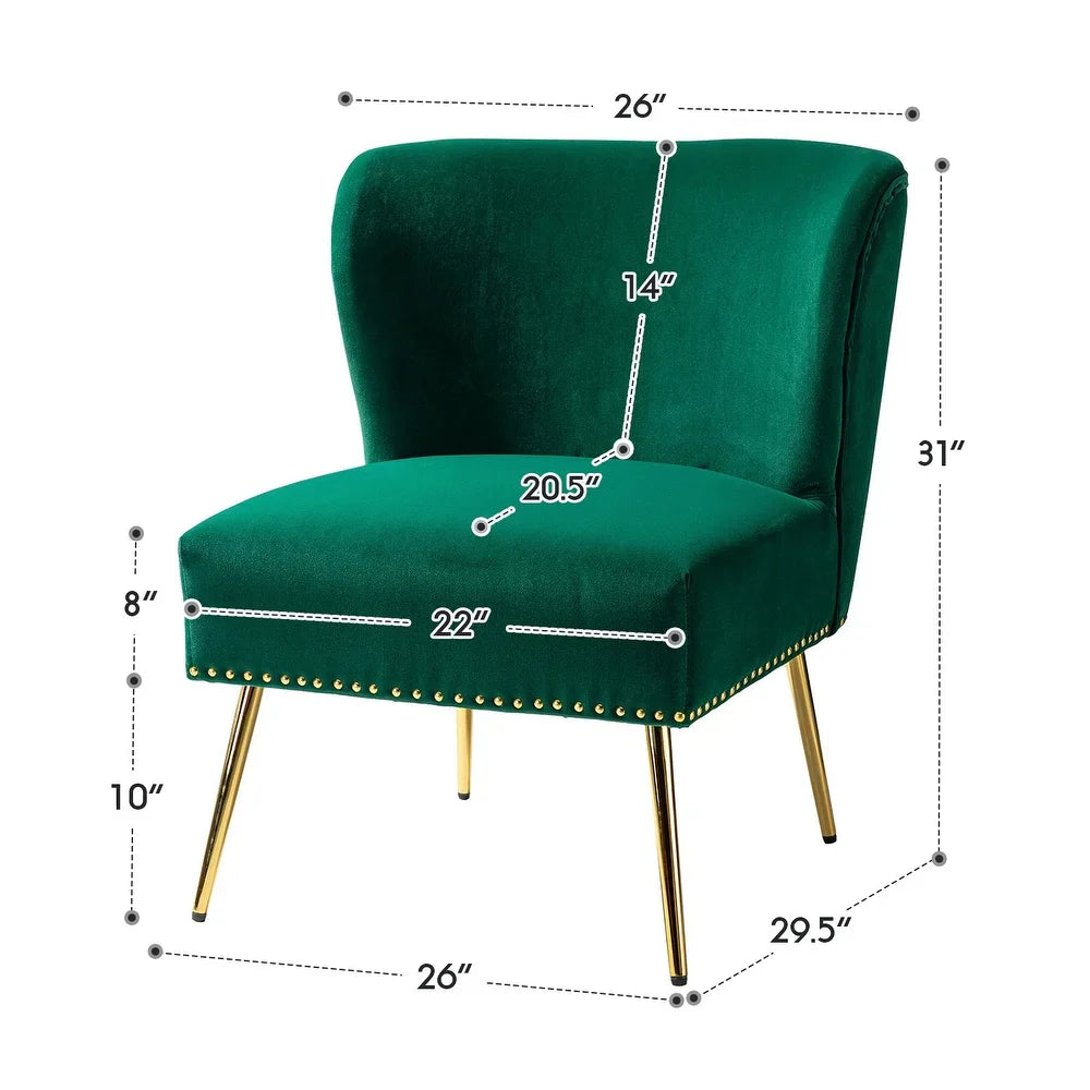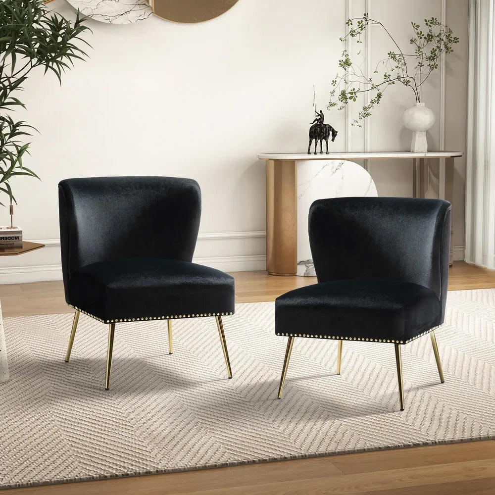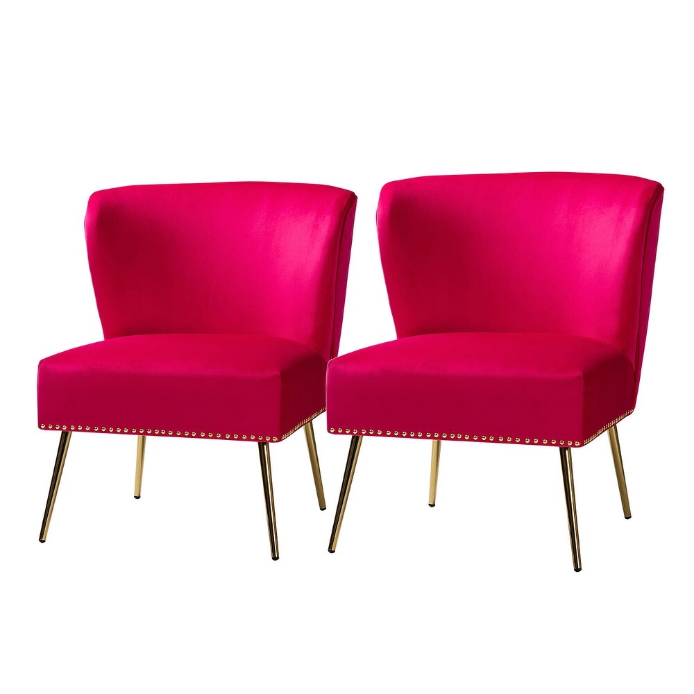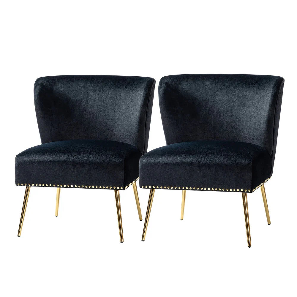 Add a touch of glam to your living room or bedroom with the Celtia Upholstered Vintage Accent Chairs with Nailhead Trim. These chairs feature a contemporary and classic style with soft velvet fabric and glam nailhead trim. The high-density foam filling with a solid and manufactured wood frame provides comfort and support, while the slender polished golden metal legs bring modern design to the timeless fashion of this piece. These chairs are perfect for any space from living room to office room to bedroom.