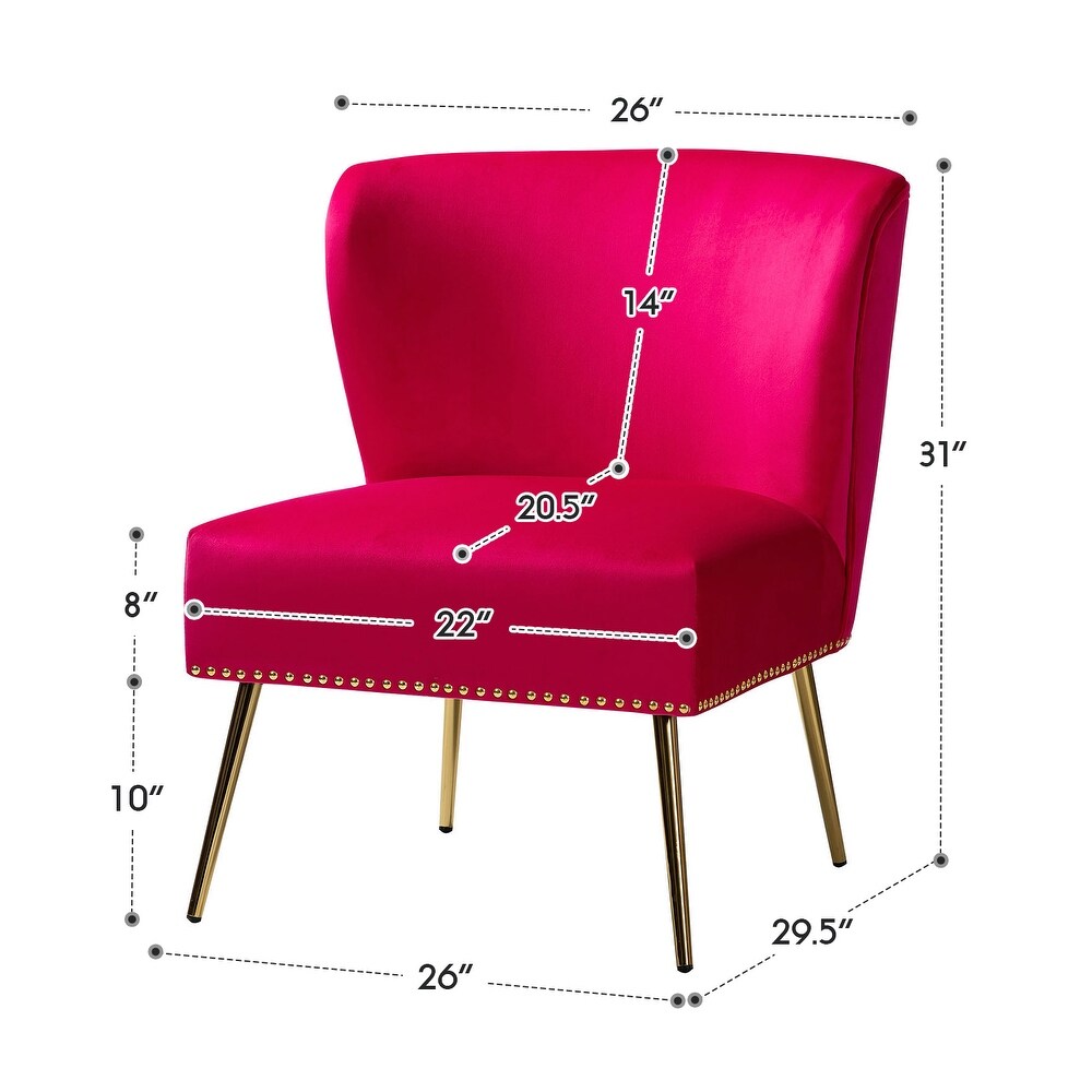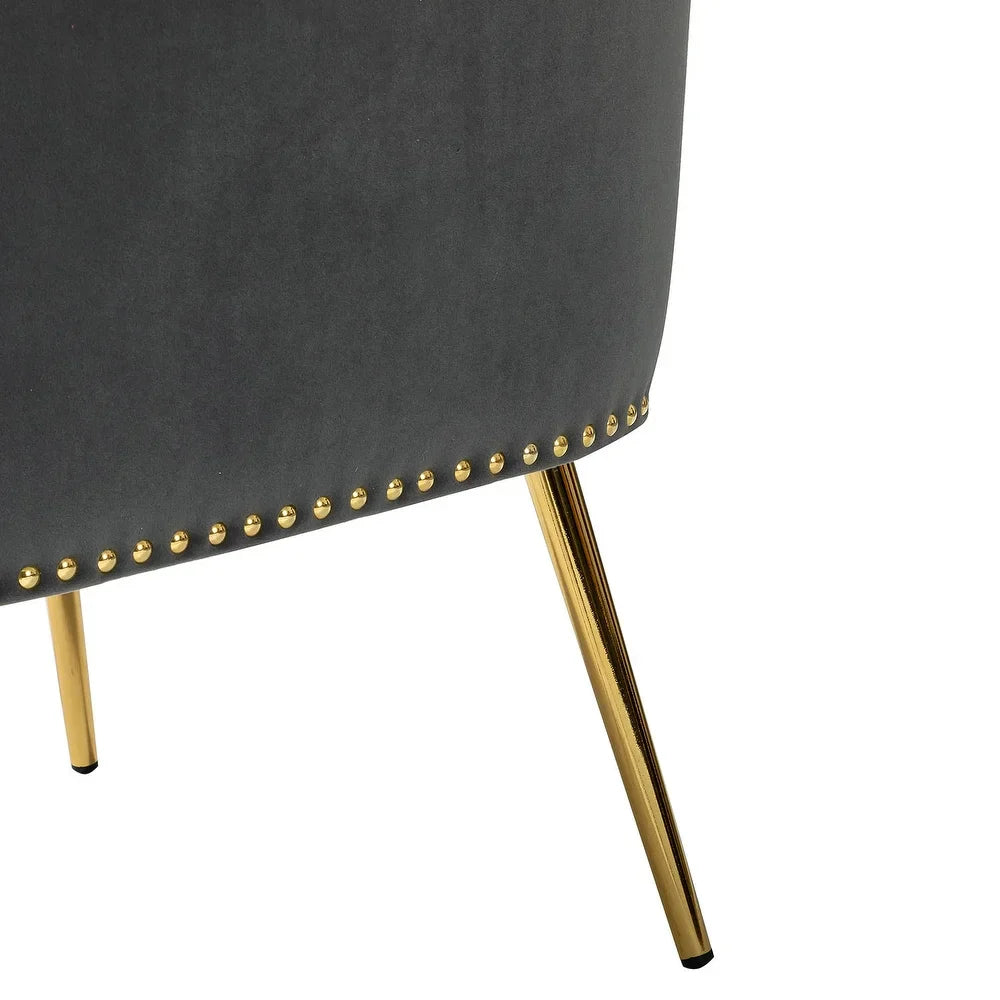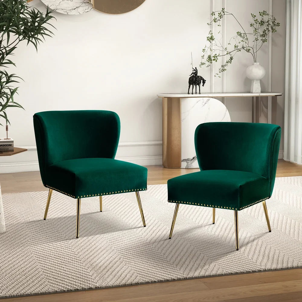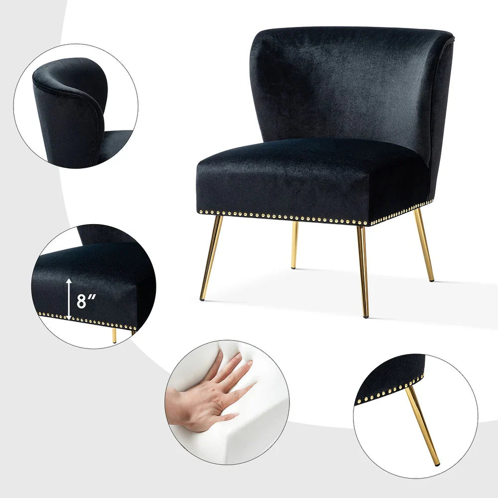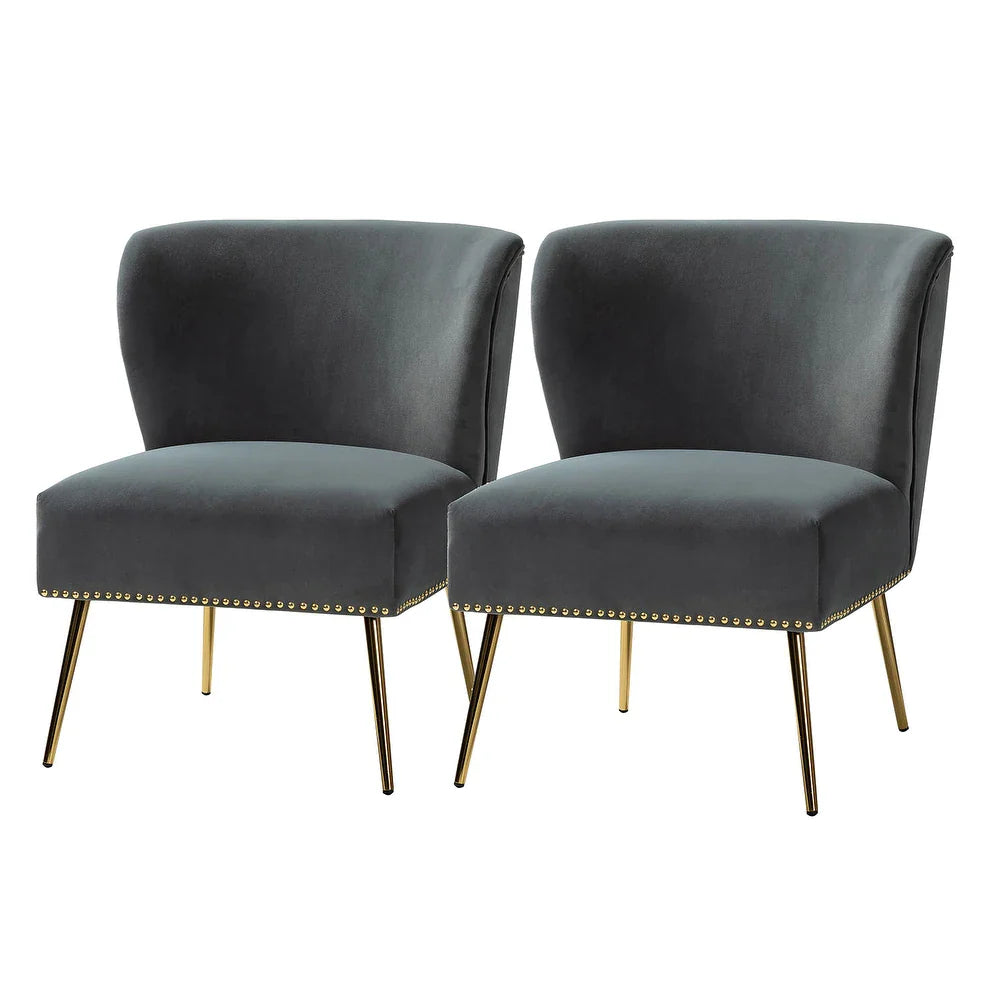 Add a touch of glam to your living room or bedroom with the Celtia Upholstered Vintage Accent Chairs with Nailhead Trim. These chairs feature a contemporary and classic style with soft velvet fabric and glam nailhead trim. The high-density foam filling with a solid and manufactured wood frame provides comfort and support, while the slender polished golden metal legs bring modern design to the timeless fashion of this piece. These chairs are perfect for any space from living room to office room to bedroom.