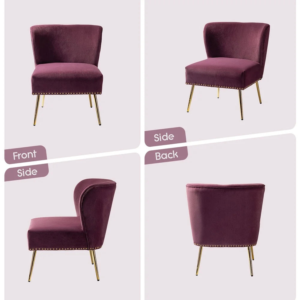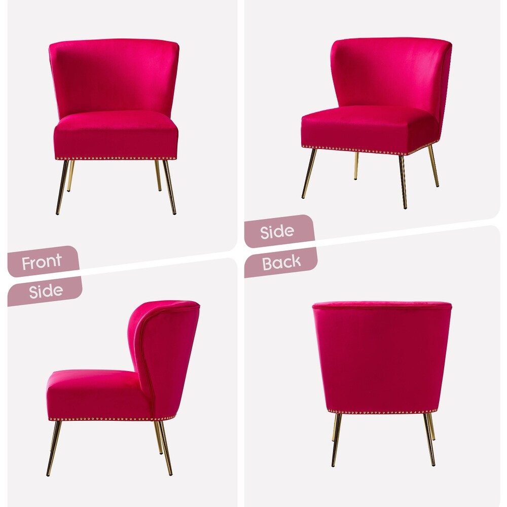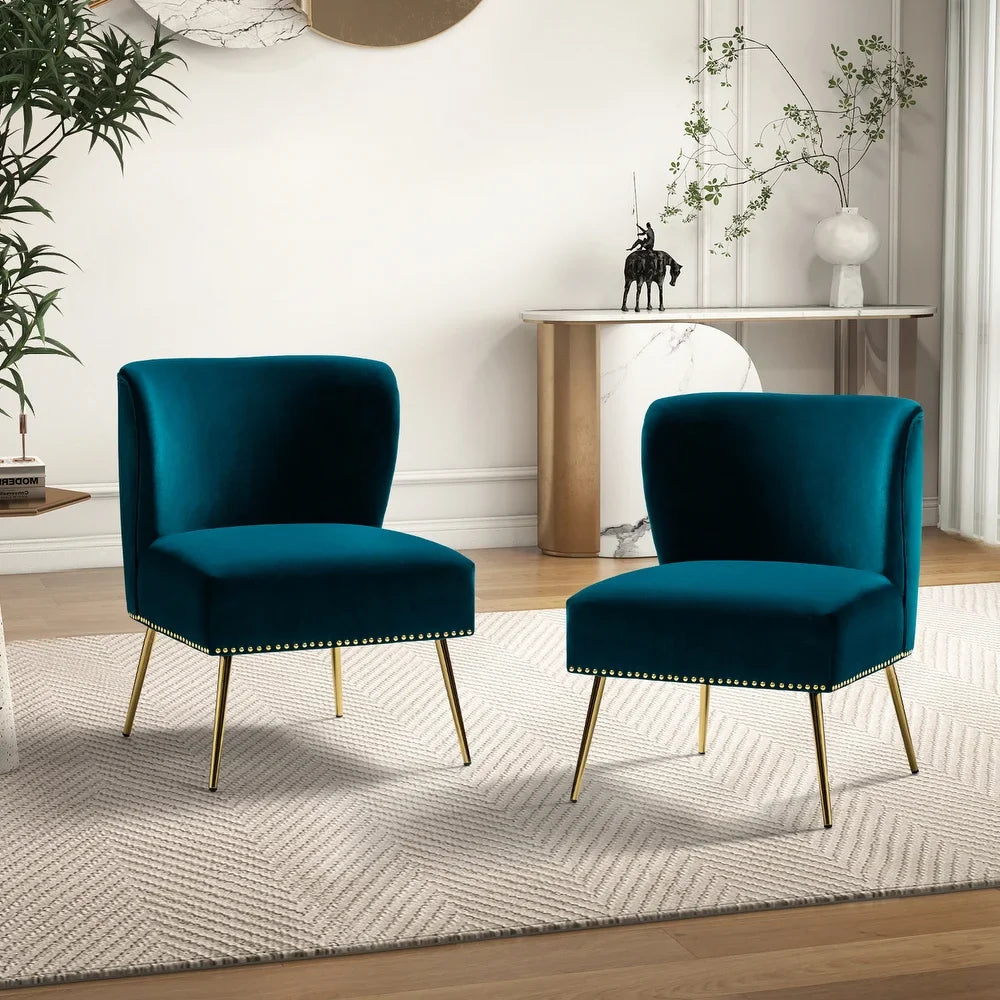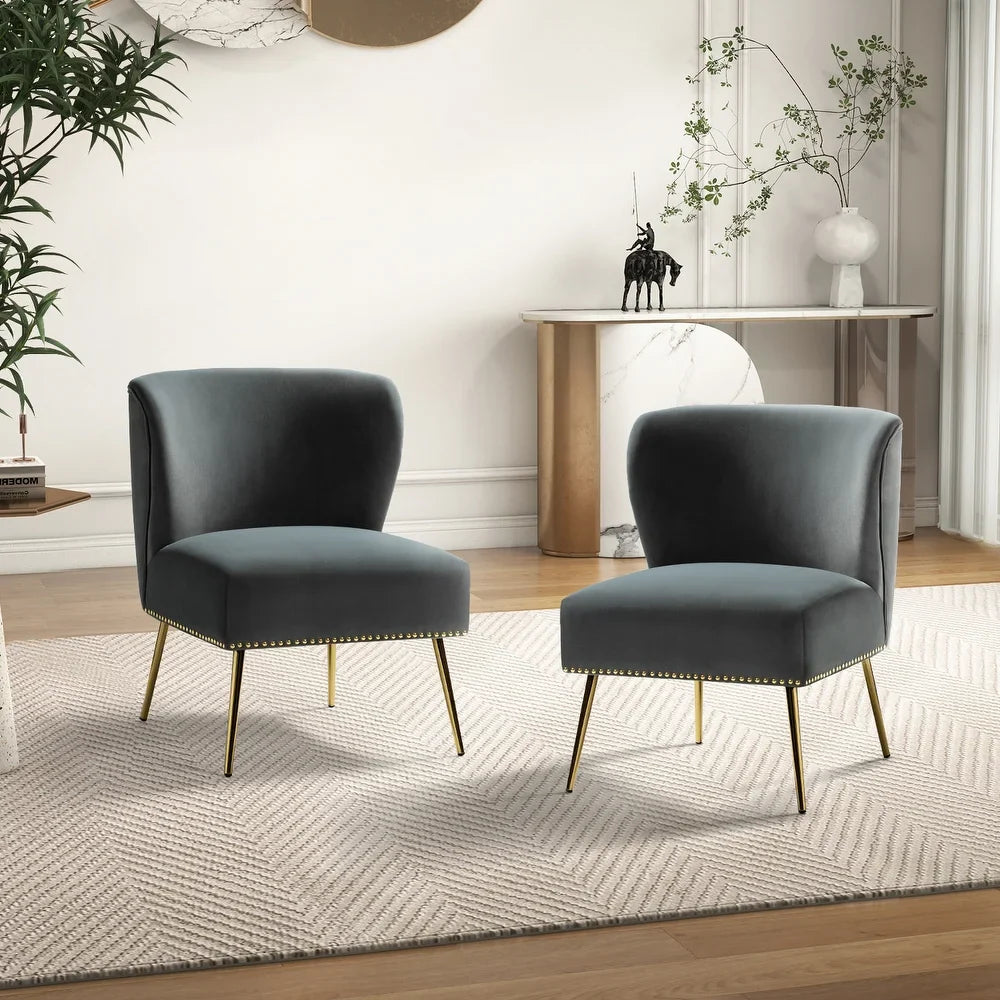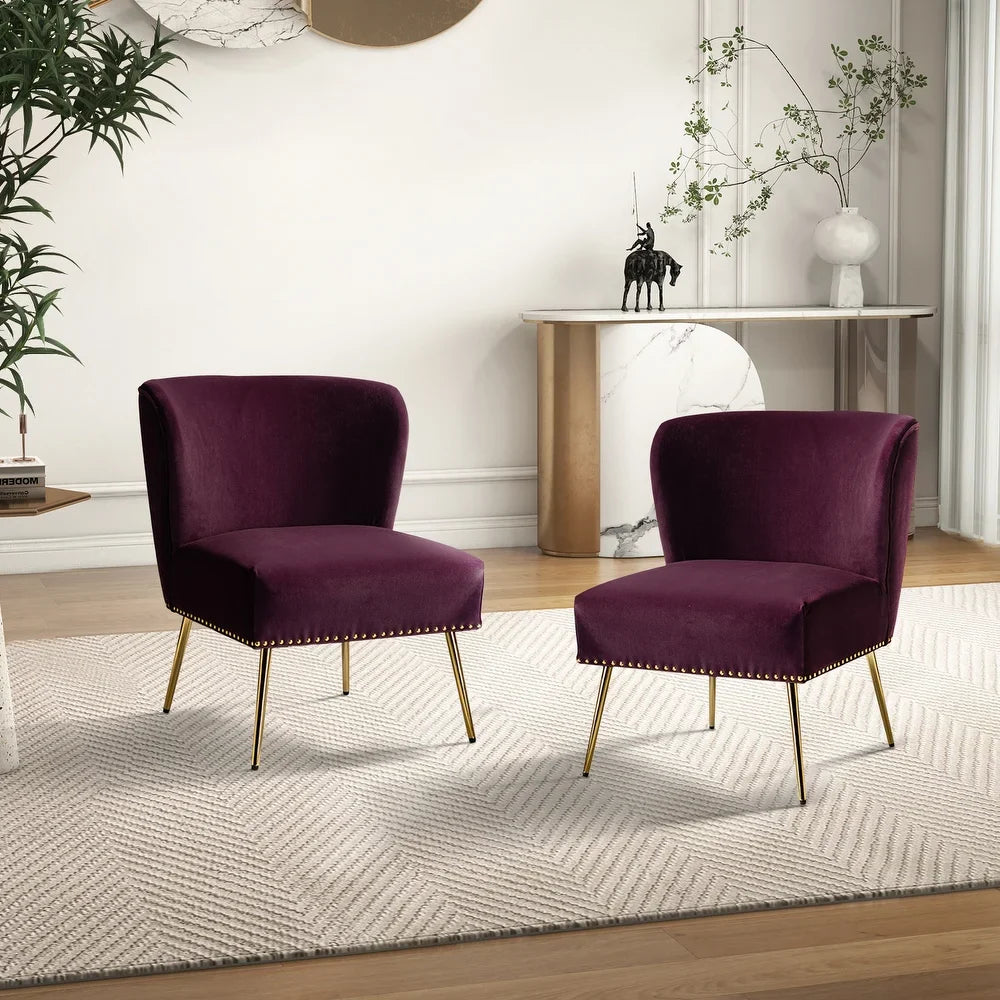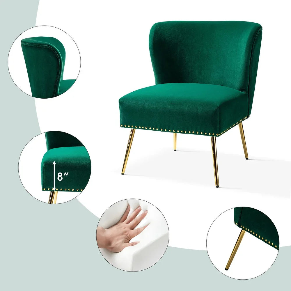 Add a touch of glam to your living room or bedroom with the Celtia Upholstered Vintage Accent Chairs with Nailhead Trim. These chairs feature a contemporary and classic style with soft velvet fabric and glam nailhead trim. The high-density foam filling with a solid and manufactured wood frame provides comfort and support, while the slender polished golden metal legs bring modern design to the timeless fashion of this piece. These chairs are perfect for any space from living room to office room to bedroom.