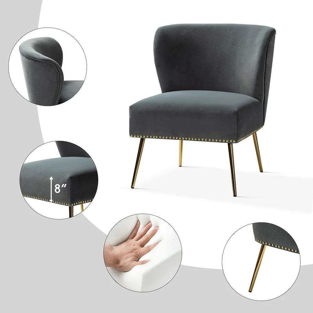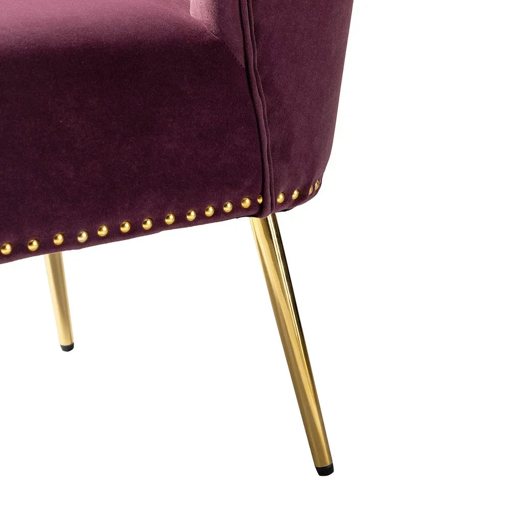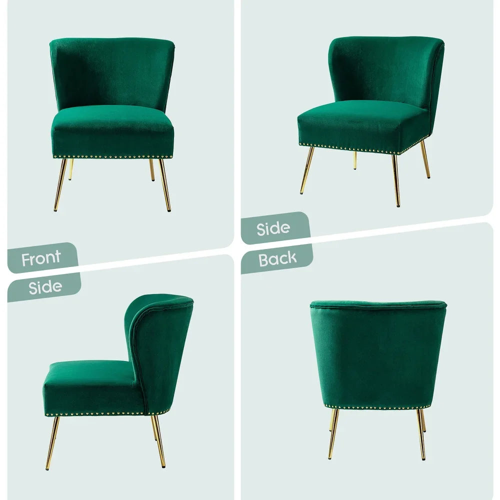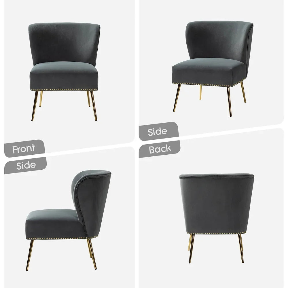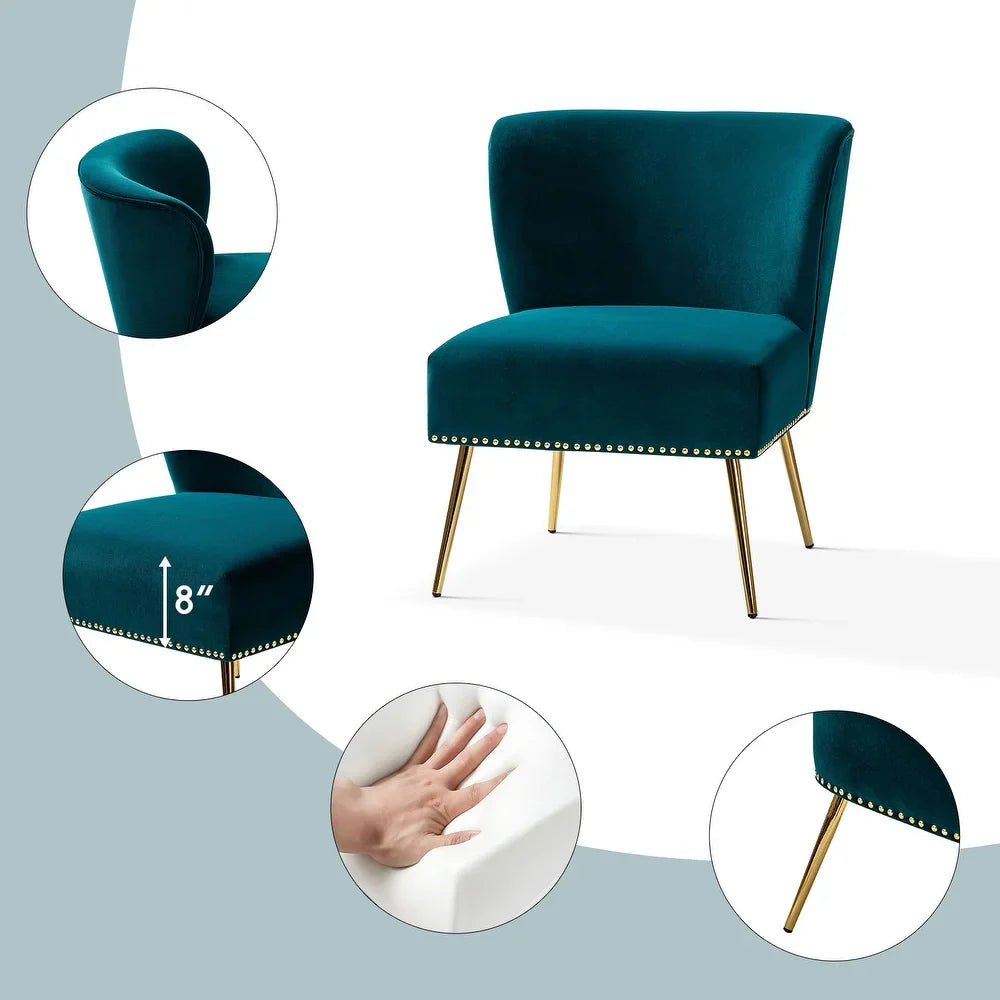 Add a touch of glam to your living room or bedroom with the Celtia Upholstered Vintage Accent Chairs with Nailhead Trim. These chairs feature a contemporary and classic style with soft velvet fabric and glam nailhead trim. The high-density foam filling with a solid and manufactured wood frame provides comfort and support, while the slender polished golden metal legs bring modern design to the timeless fashion of this piece. These chairs are perfect for any space from living room to office room to bedroom.