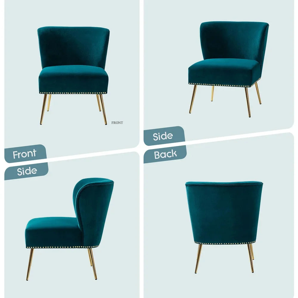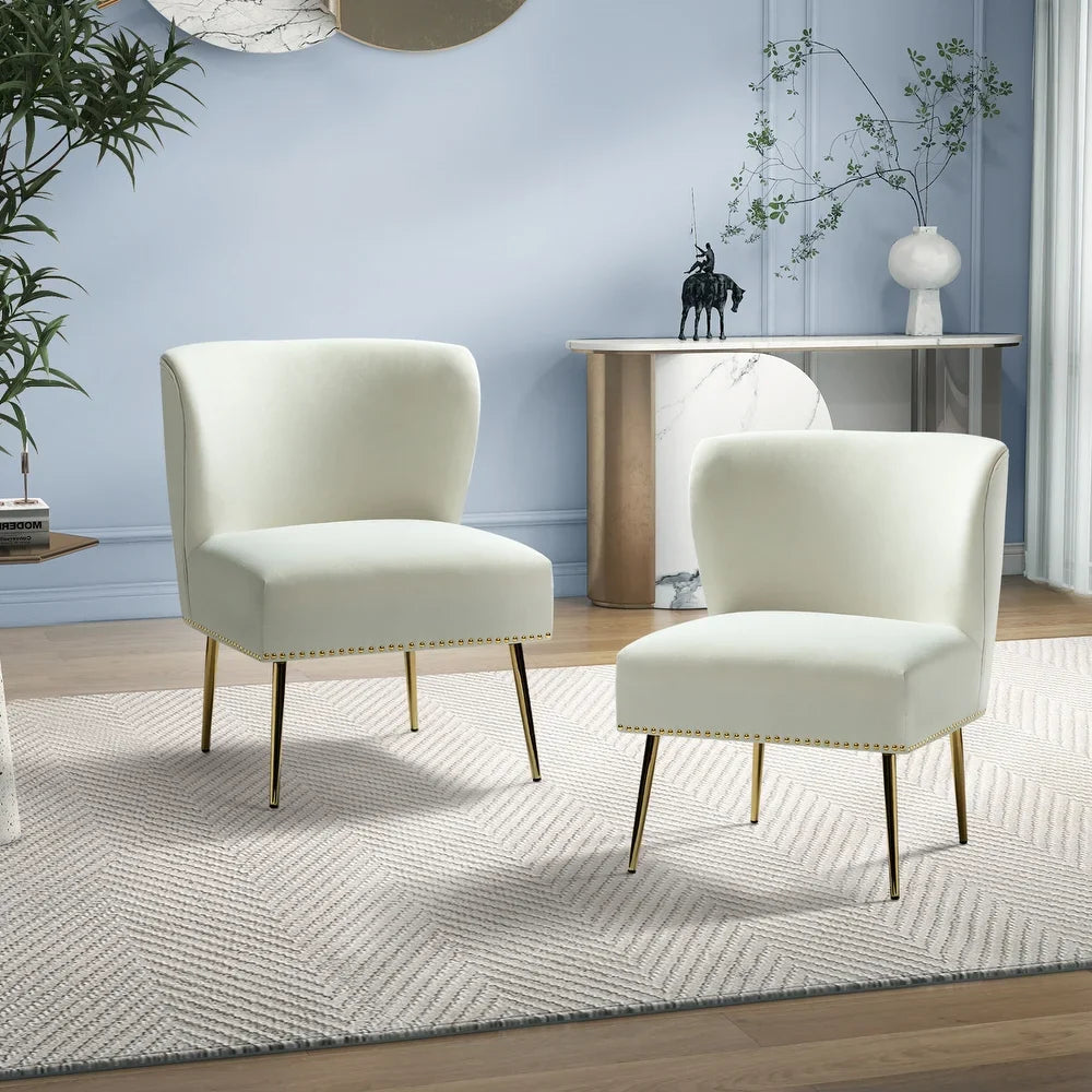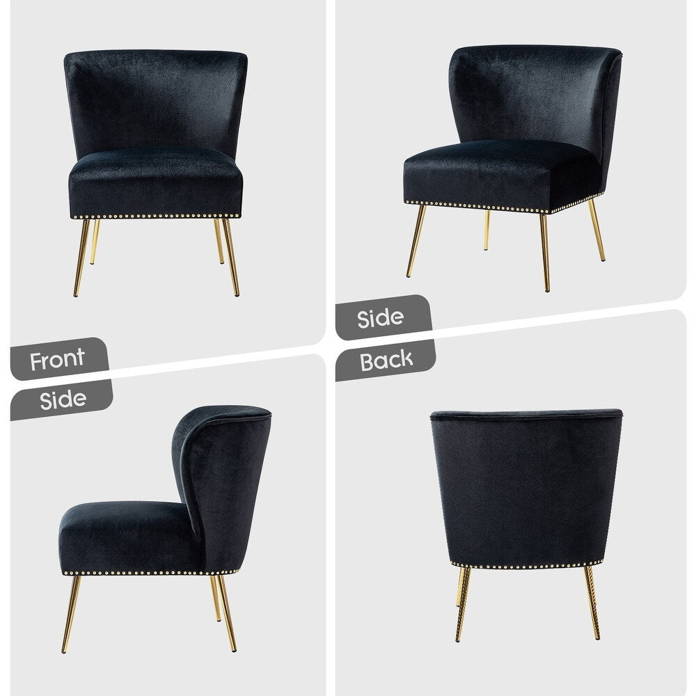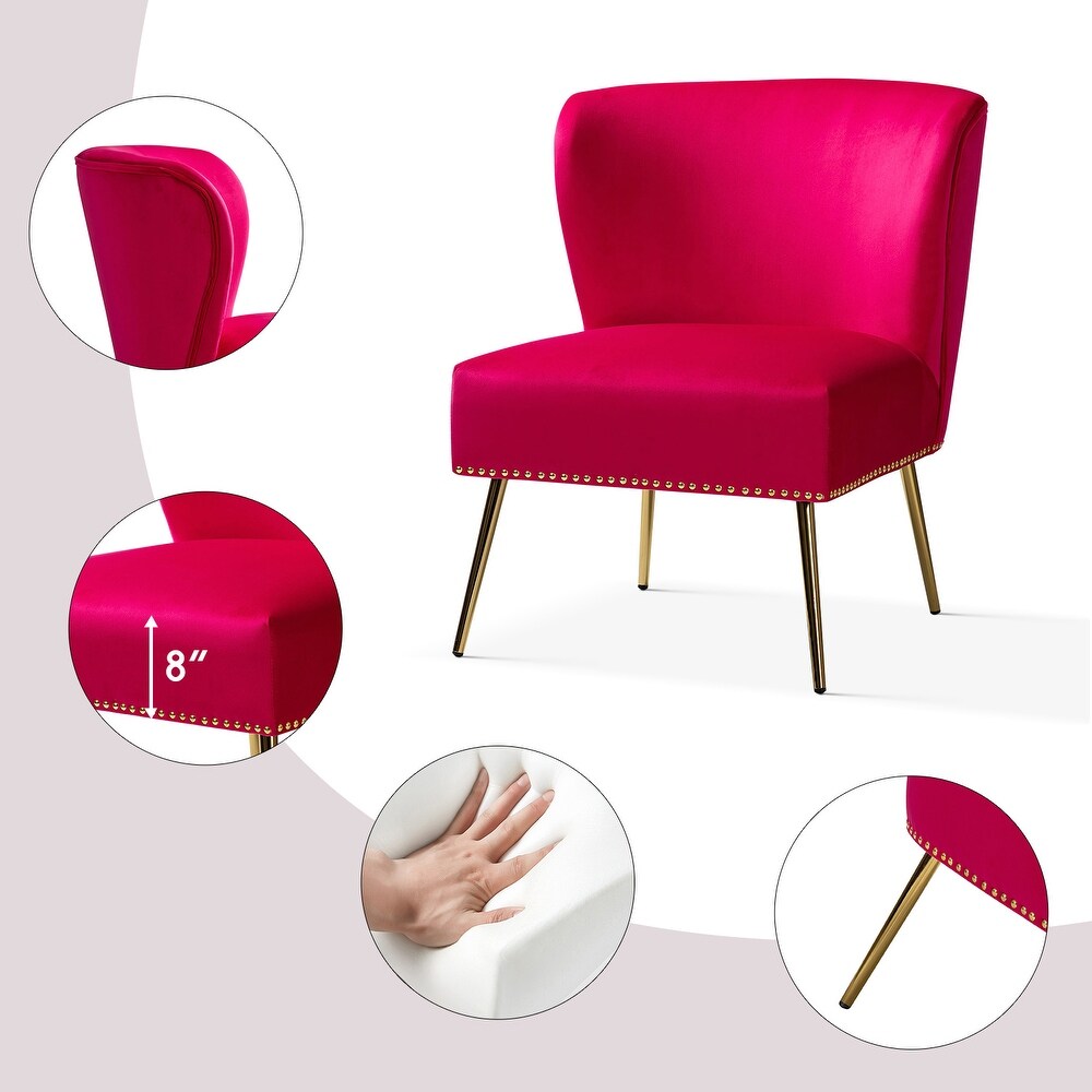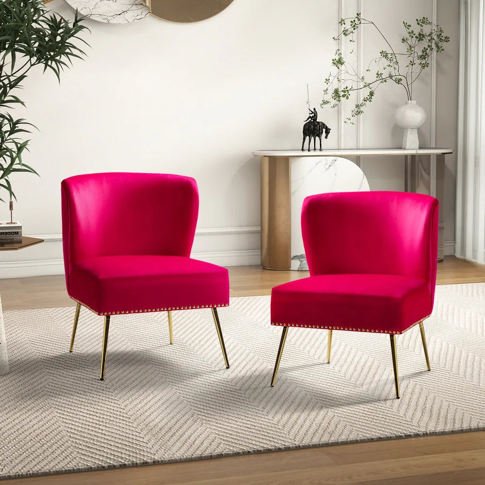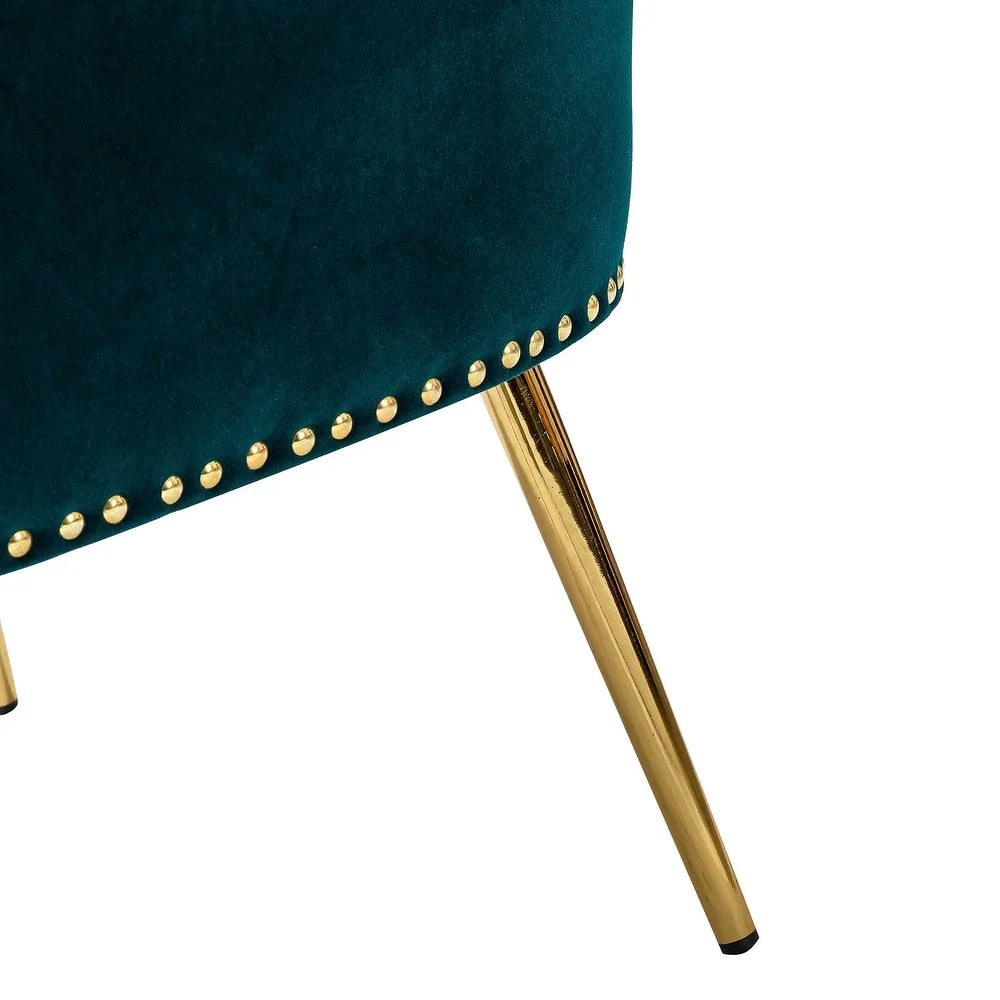 Add a touch of glam to your living room or bedroom with the Celtia Upholstered Vintage Accent Chairs with Nailhead Trim. These chairs feature a contemporary and classic style with soft velvet fabric and glam nailhead trim. The high-density foam filling with a solid and manufactured wood frame provides comfort and support, while the slender polished golden metal legs bring modern design to the timeless fashion of this piece. These chairs are perfect for any space from living room to office room to bedroom.