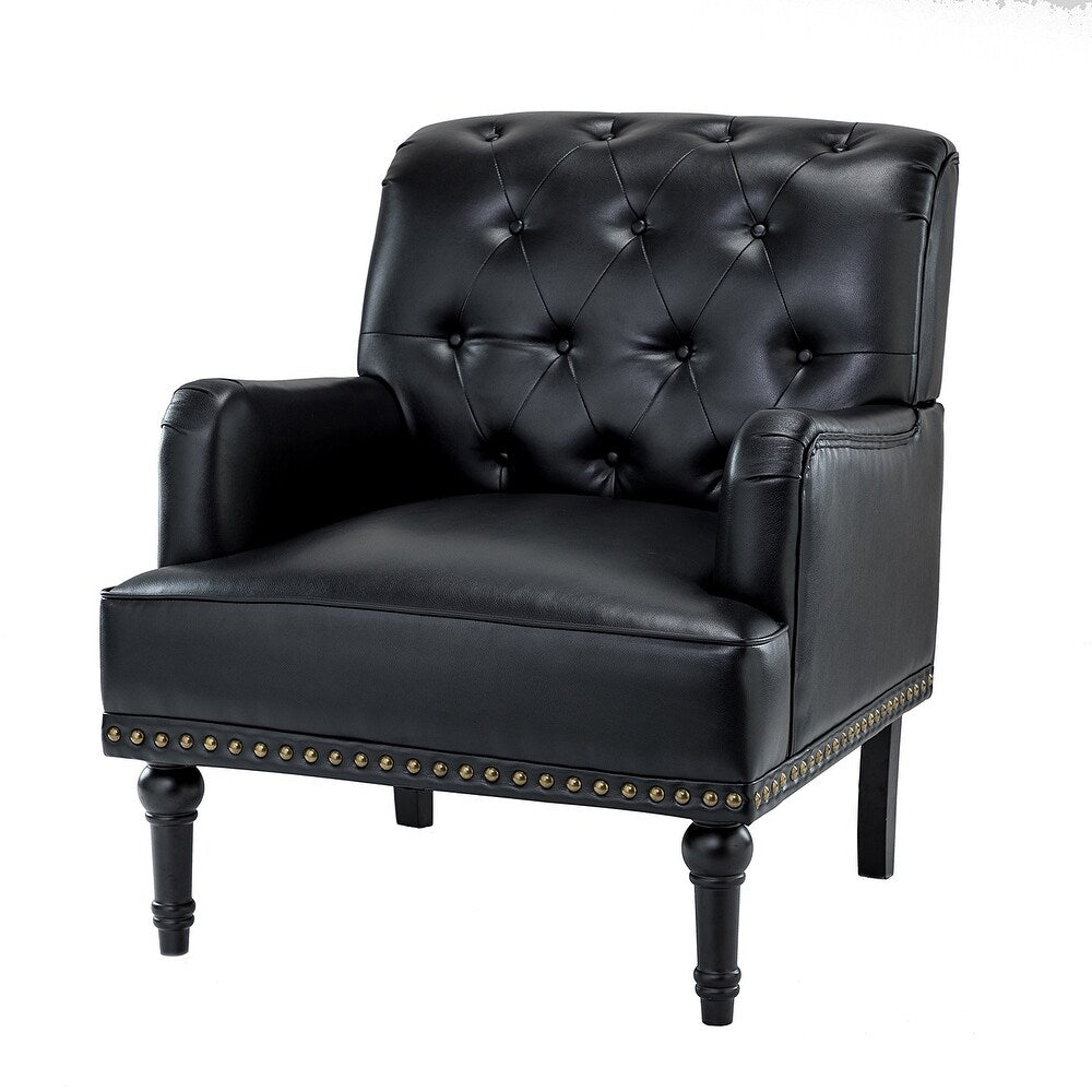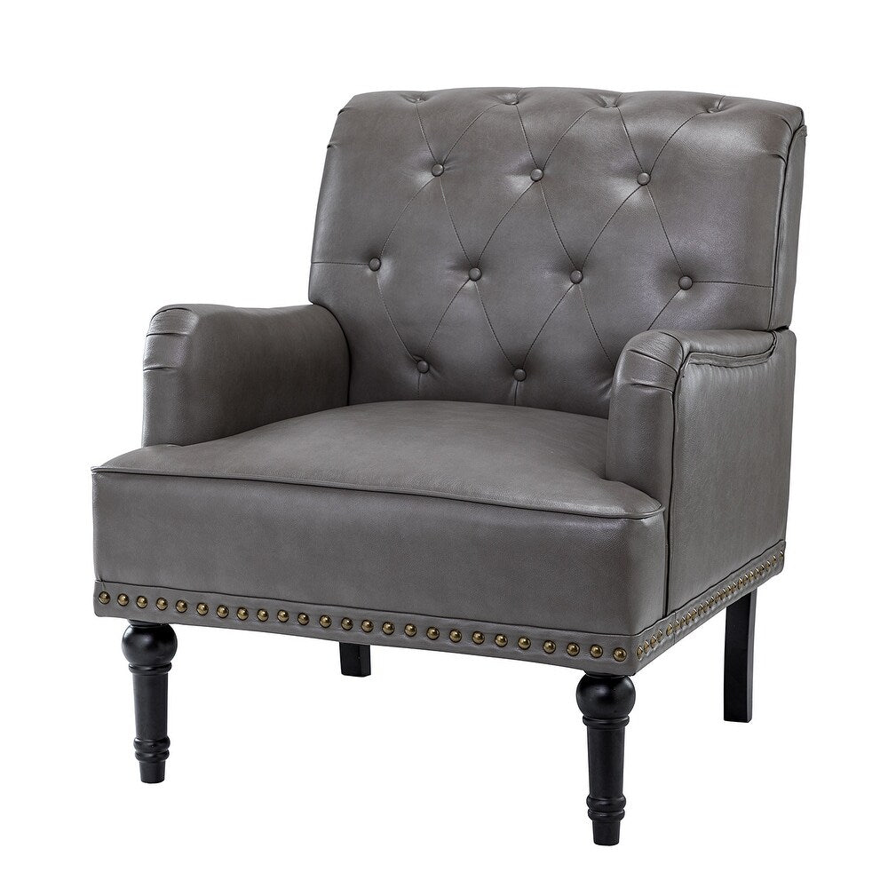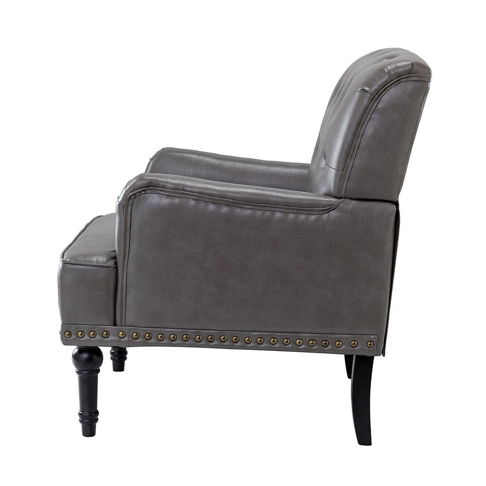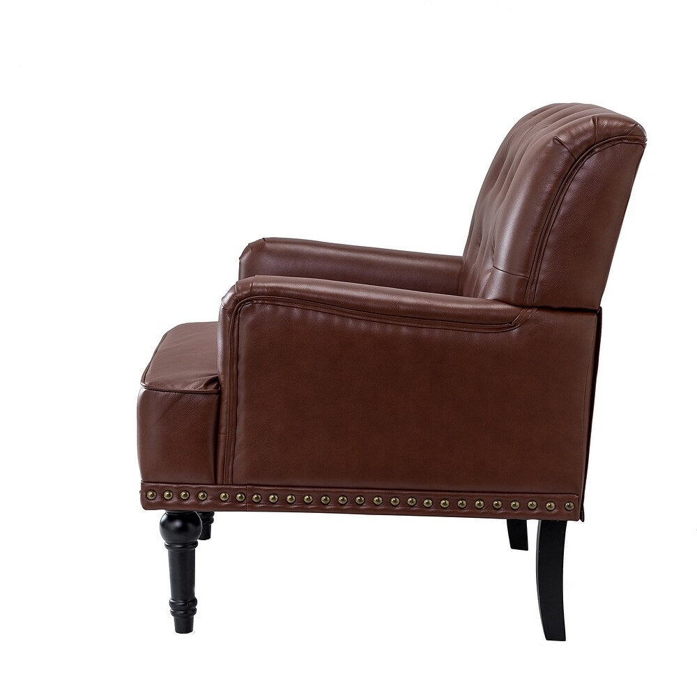 Unique style and classic design combine in this inviting armchair. It features a sturdy wood frame, wrapped in PU upholstery with a button-tufted design, elegantly carved front legs, and simple back legs that offer a visual variation. The foam-filled back provides extra support, while the nailhead trim adds a dose of vintage design to it. It is suitable for most of your daily scenarios such as study room, bedroom, and living room. Whether you're enjoying quality family time or entertaining guests, this armchair will extend an open invitation for everyone to relax.