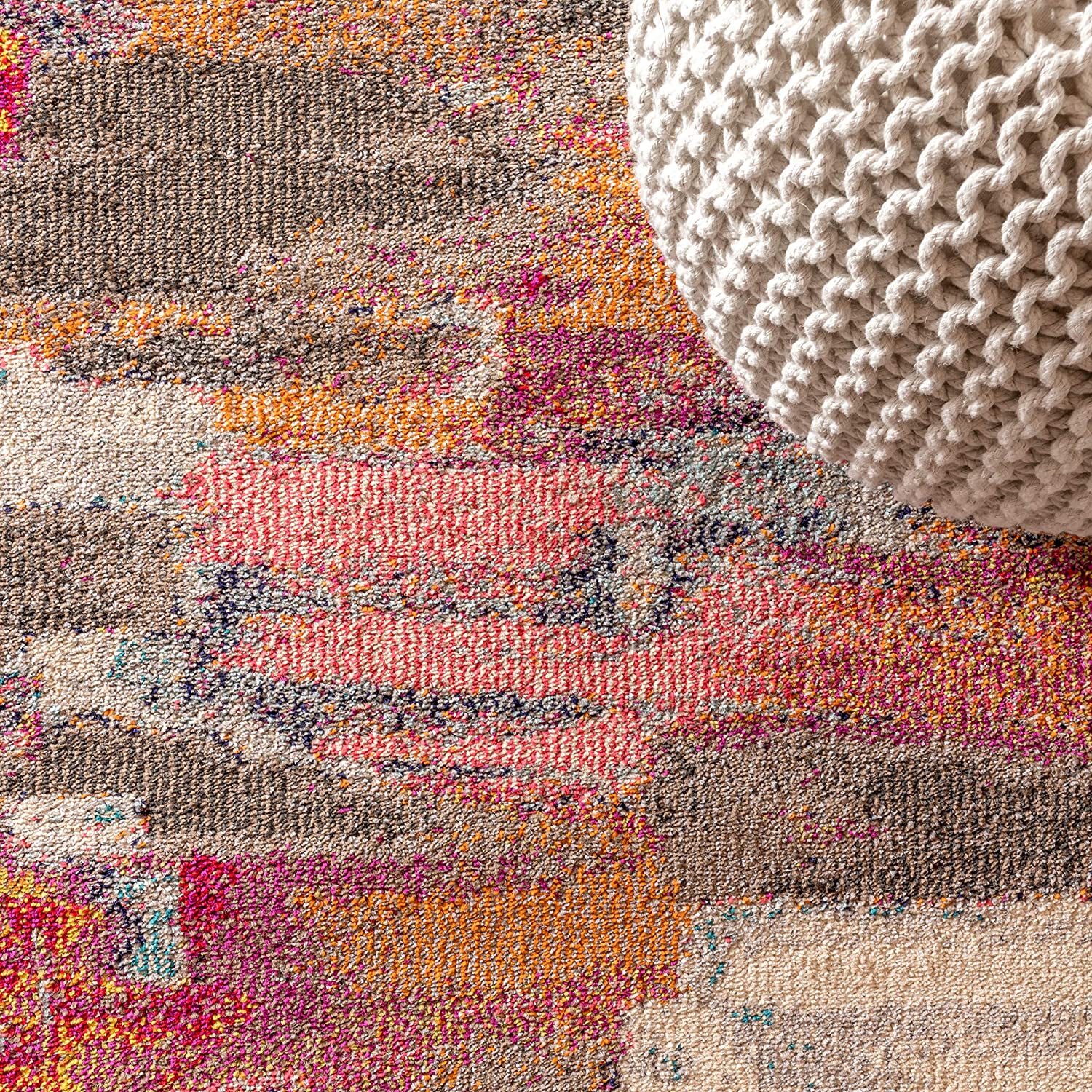 - Combining tones of red, pink, coral, orange, gray, beige and ivory, this rug is a versatile addition to any color scheme