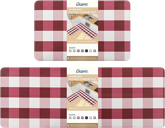 Cushioned Anti-Fatigue Waterproof Non-Slip Buffalo Plaid Heavy Duty PVC Ergonomic Comfort Standing Foam Mats, Rose&White, 17.3''x27.5''
