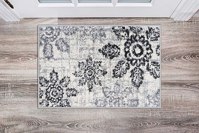 Distressed Floral Soft Ivory Gray Shag Area Rug