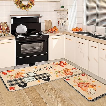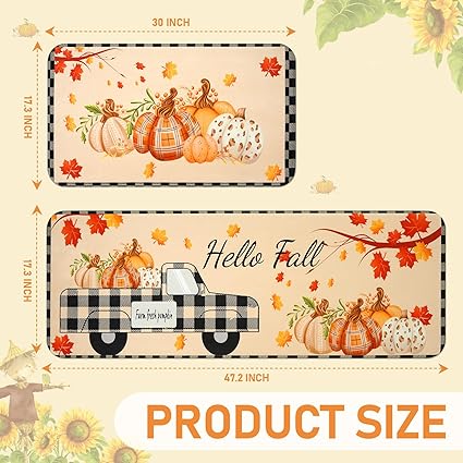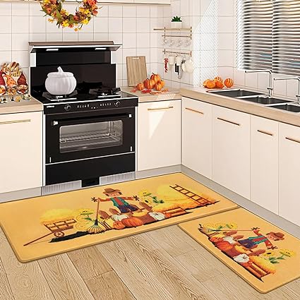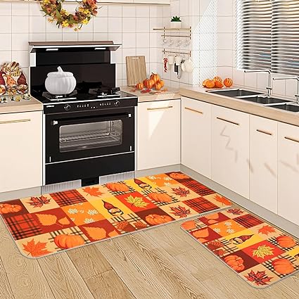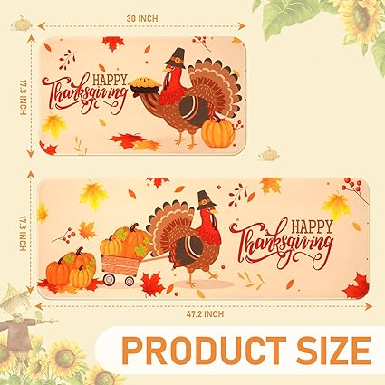 - MULTIPURPOSE 2 PIECE SET: The 2 kitchen rugs measure 17" x 30" and 17" x 47" with Low Pile of 0.25". Just right for use in front of the oven and stovetop in the kitchen. In addition our Thanksgiving Fall rugs can also add a bright look to your kitchen, dining room, bathroom, doorway.