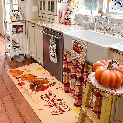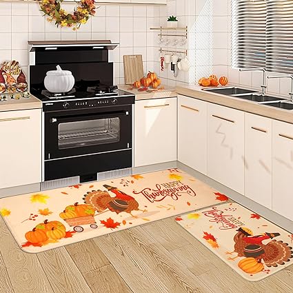 - NICE THANKSGIVING GIFT: These two kitchen floor mats have both beautiful Thanksgiving patterns and bring a new experience in the kitchen, perfect as a gift for a loved one or friend who is always in the kitchen, if you have any questions feel free to contact us.
