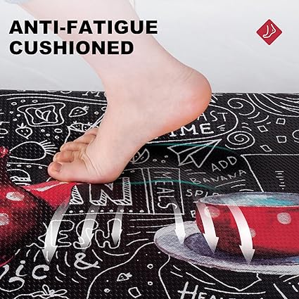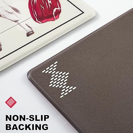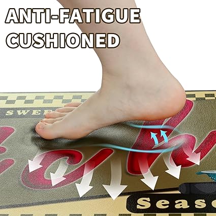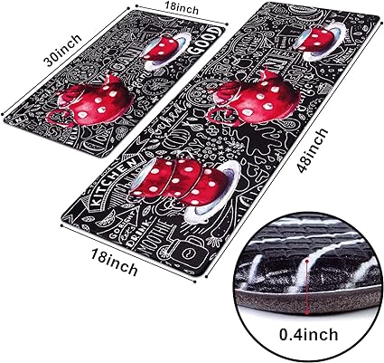 - šćSUITABLE SIZEćThe vintage farm decor anti-fatigue kitchen rug set contains two sizes, 18 x 30 inches and 18 x 48 inches; thickness: 10mm/0.4 inch; this farmhouse kitchen rug fits perfectly in front of the kitchen sink or the area in front of the washer and dryer side by side.