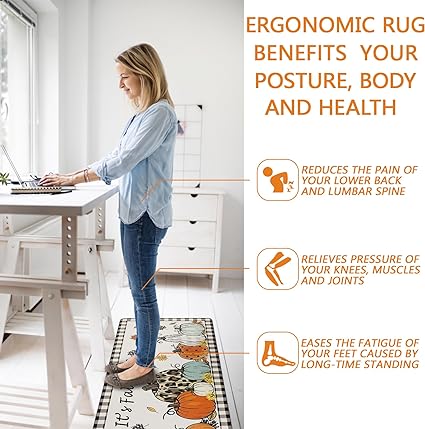- 🍁【Cushioned Kitchen Floor Mat Set】:These thanksgiving anti-fatigue kitchen mats is made of high density pvc foam as the middle layer which make this kitchen rugs and mats ergonomically engineered.Thickness measures about 0.4inch that will provides comfortable support to help improve circulation and posture and to ensure that you are able to stand comfortably while working in the kitchen or at any work station. Perfect for any space in which people stand for long periods of time.