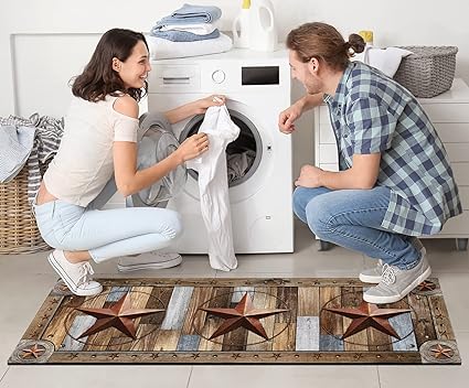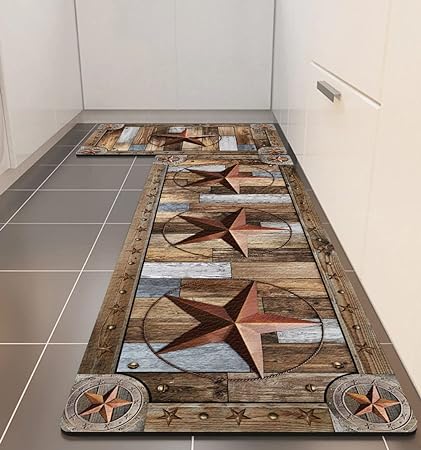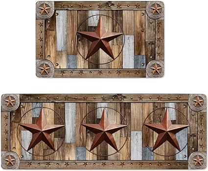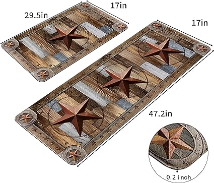Farmhouse Wood Kitchen Rugs Mats Set of 2 Rustic Texas Star Anti-Fatigue Cushioned Kitchen Floor Mat Non-Slip Backing Washable Kitchen Rugs Set Office Laundry, 17inchx29.5inch+17inchx47inch