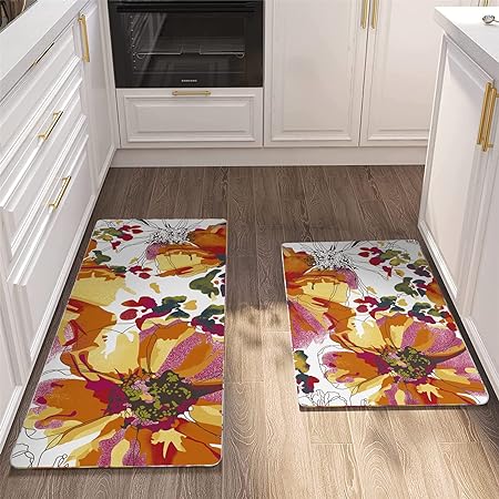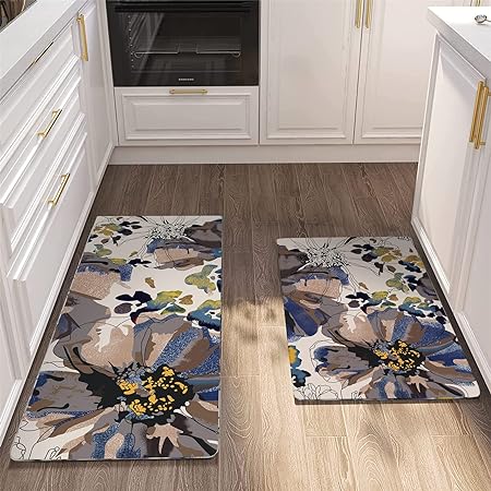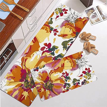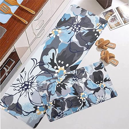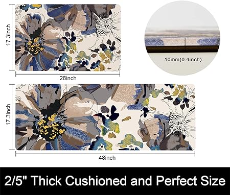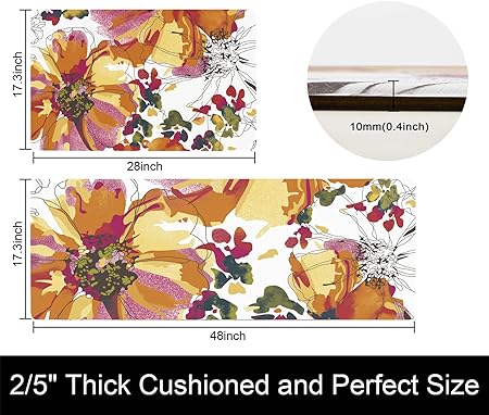 Floral Anti Fatigue 2 Pieces - 17.3’’x29.5’’ + 17.3’’x47.2’’ Comfort 0.4’’ Thick Cushioned Padded Waterproof Flowers Kitchen Rugs