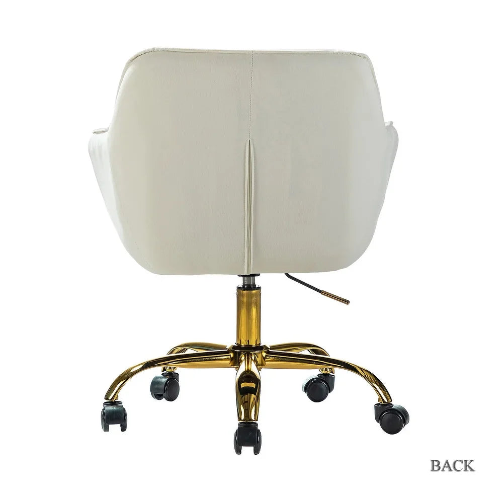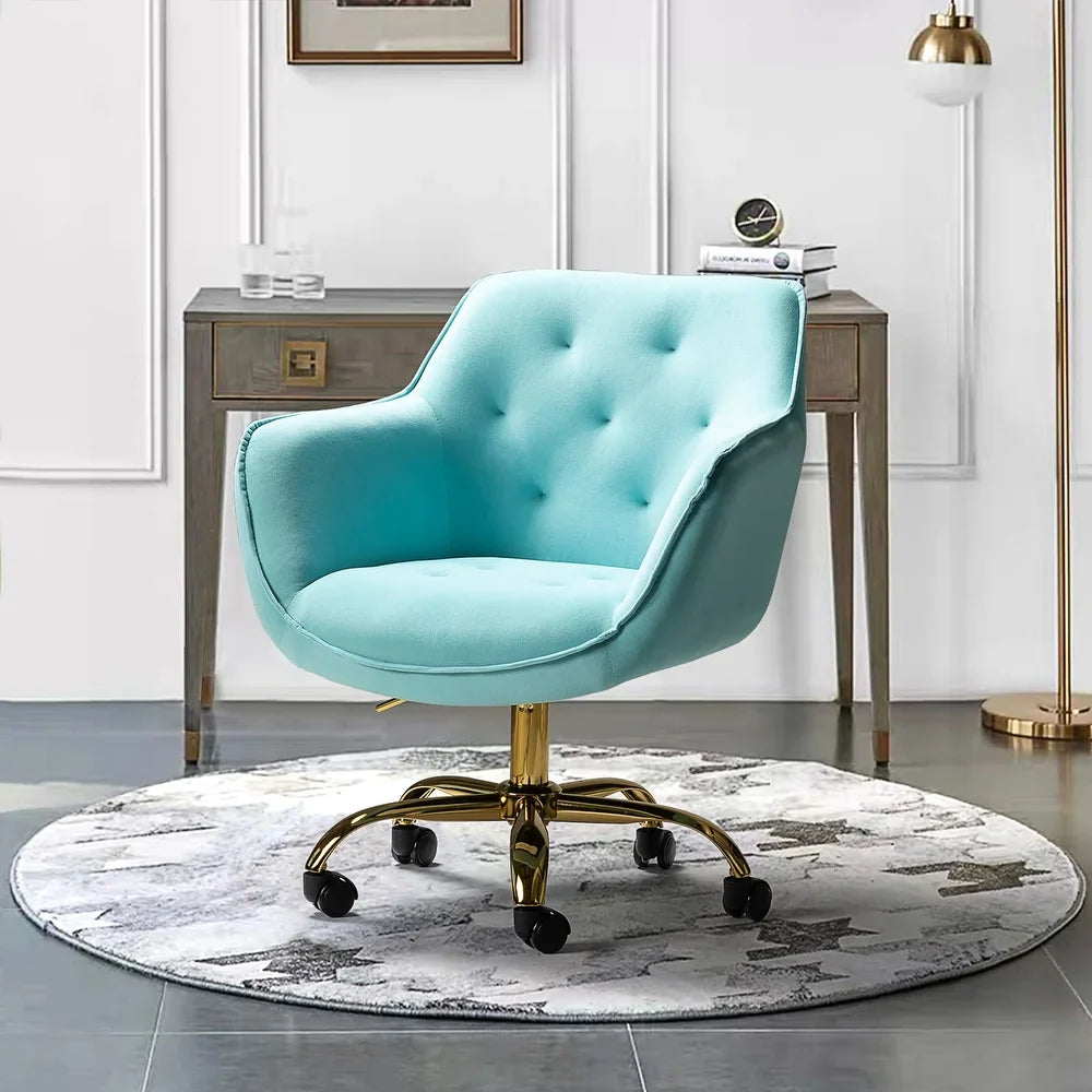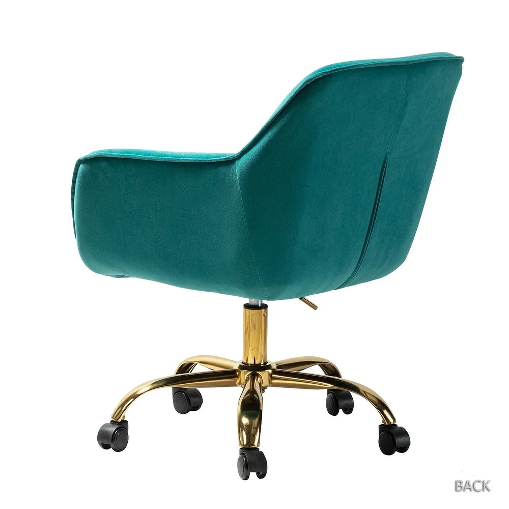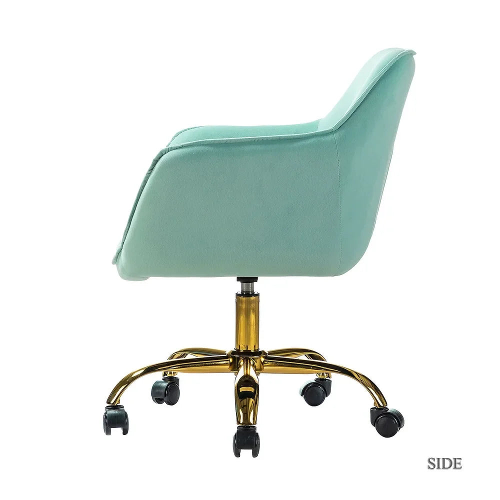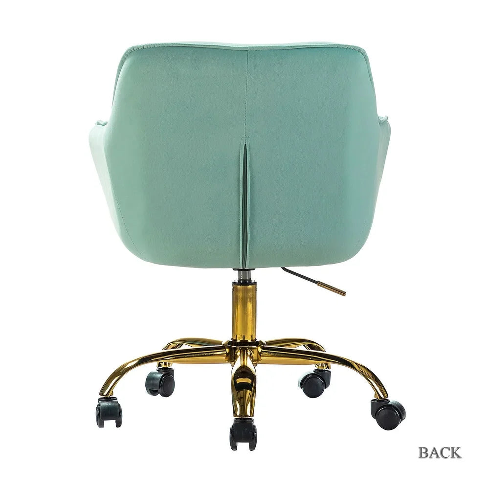 Upgrade your workspace with this contemporary Galera Swivel Task Chair. The chic design and variety of vibrant colors complement any taste, making it perfect for any office or home office. The mid-backrest and integrated arms are tailored with tufting and piped edges, while high-density foam provides comfort and support. The chair's sturdy golden metal legs and 360-degree wheels make it easy to move around the room, and it is also height-adjustable to fit your professional needs. This cute computer chair is ideal for any casual or professional working area.