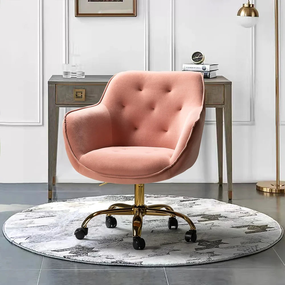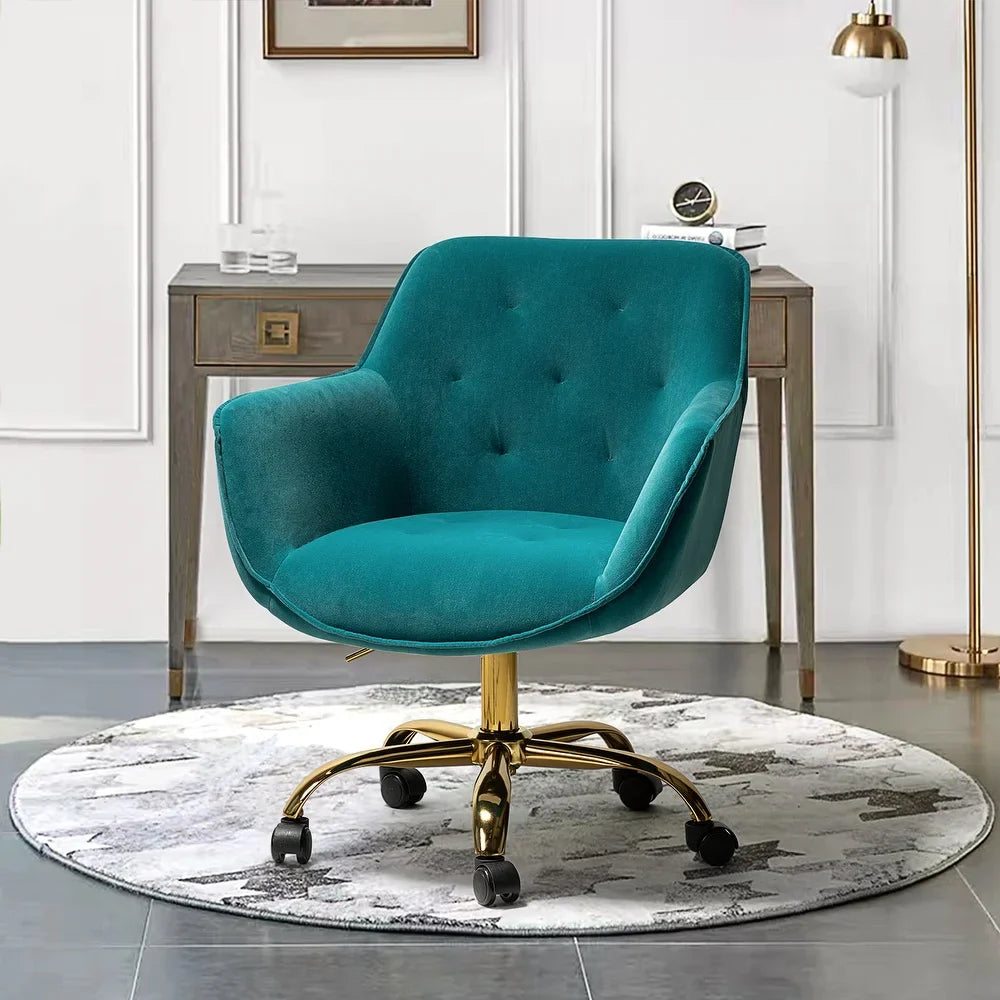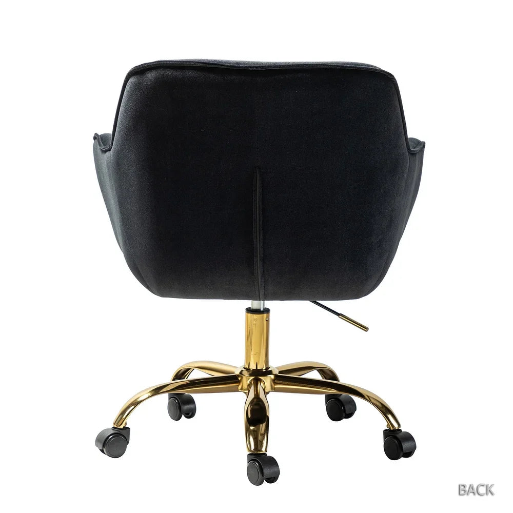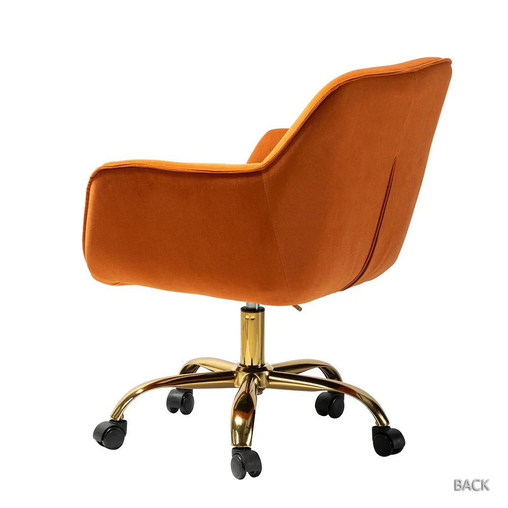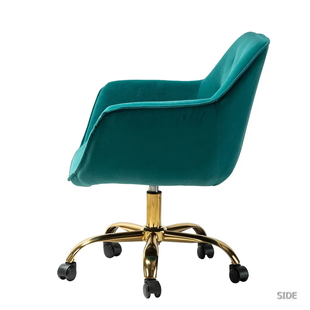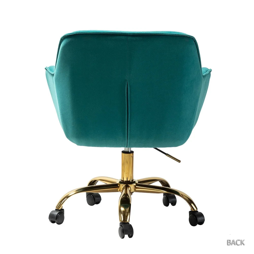 Upgrade your workspace with this contemporary Galera Swivel Task Chair. The chic design and variety of vibrant colors complement any taste, making it perfect for any office or home office. The mid-backrest and integrated arms are tailored with tufting and piped edges, while high-density foam provides comfort and support. The chair's sturdy golden metal legs and 360-degree wheels make it easy to move around the room, and it is also height-adjustable to fit your professional needs. This cute computer chair is ideal for any casual or professional working area.