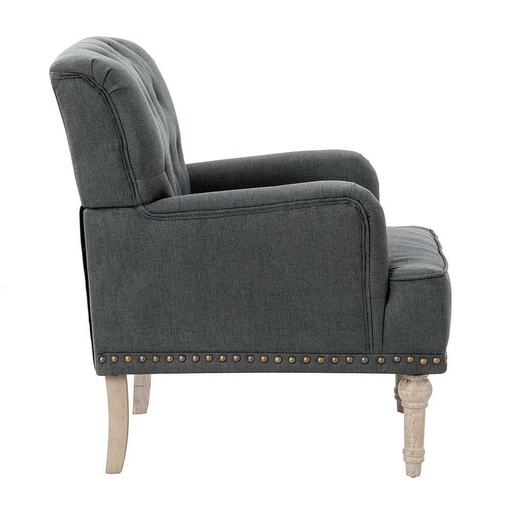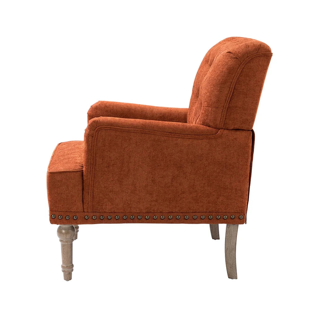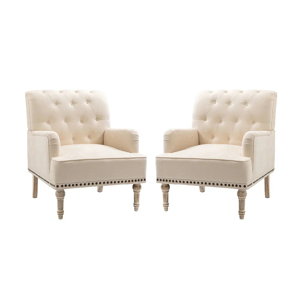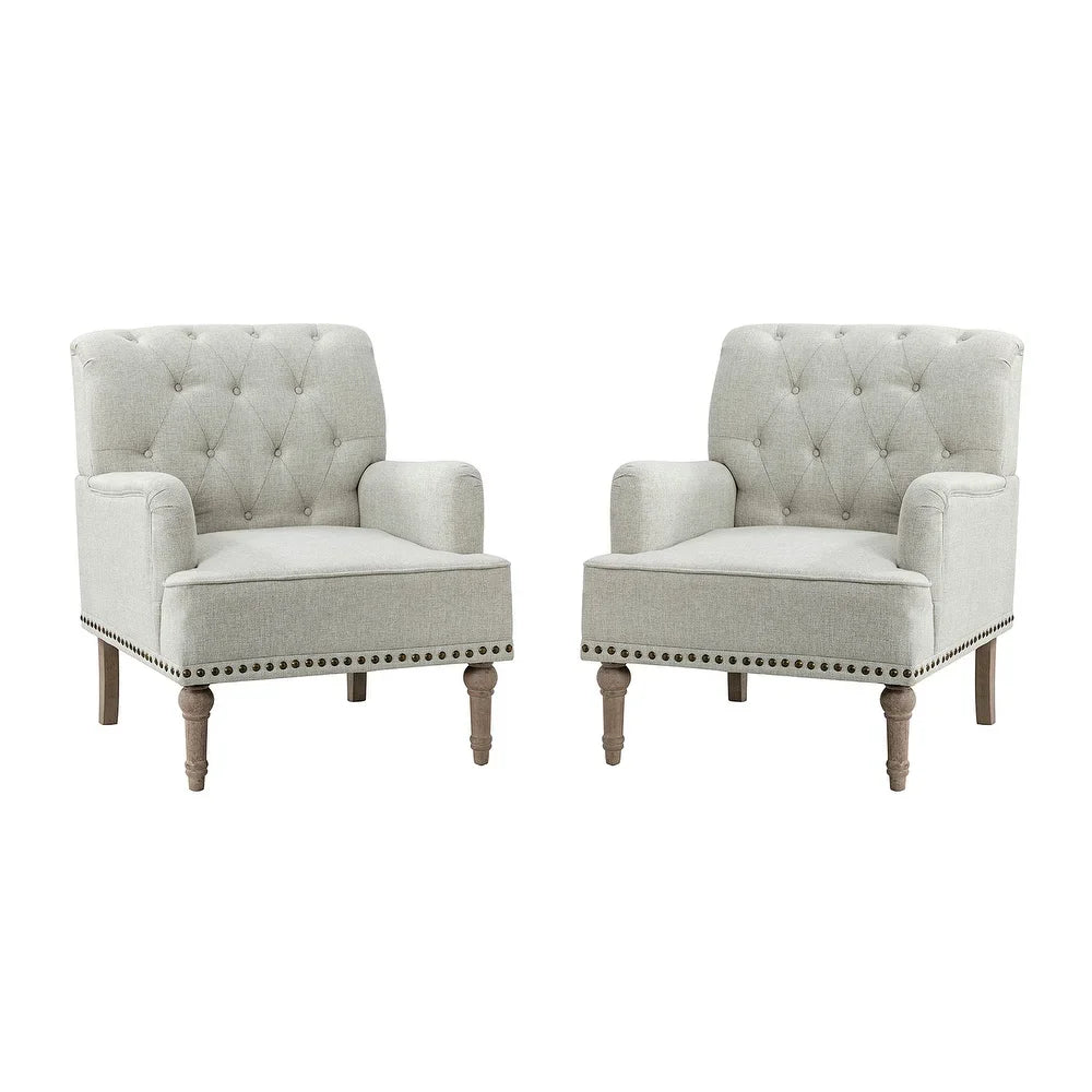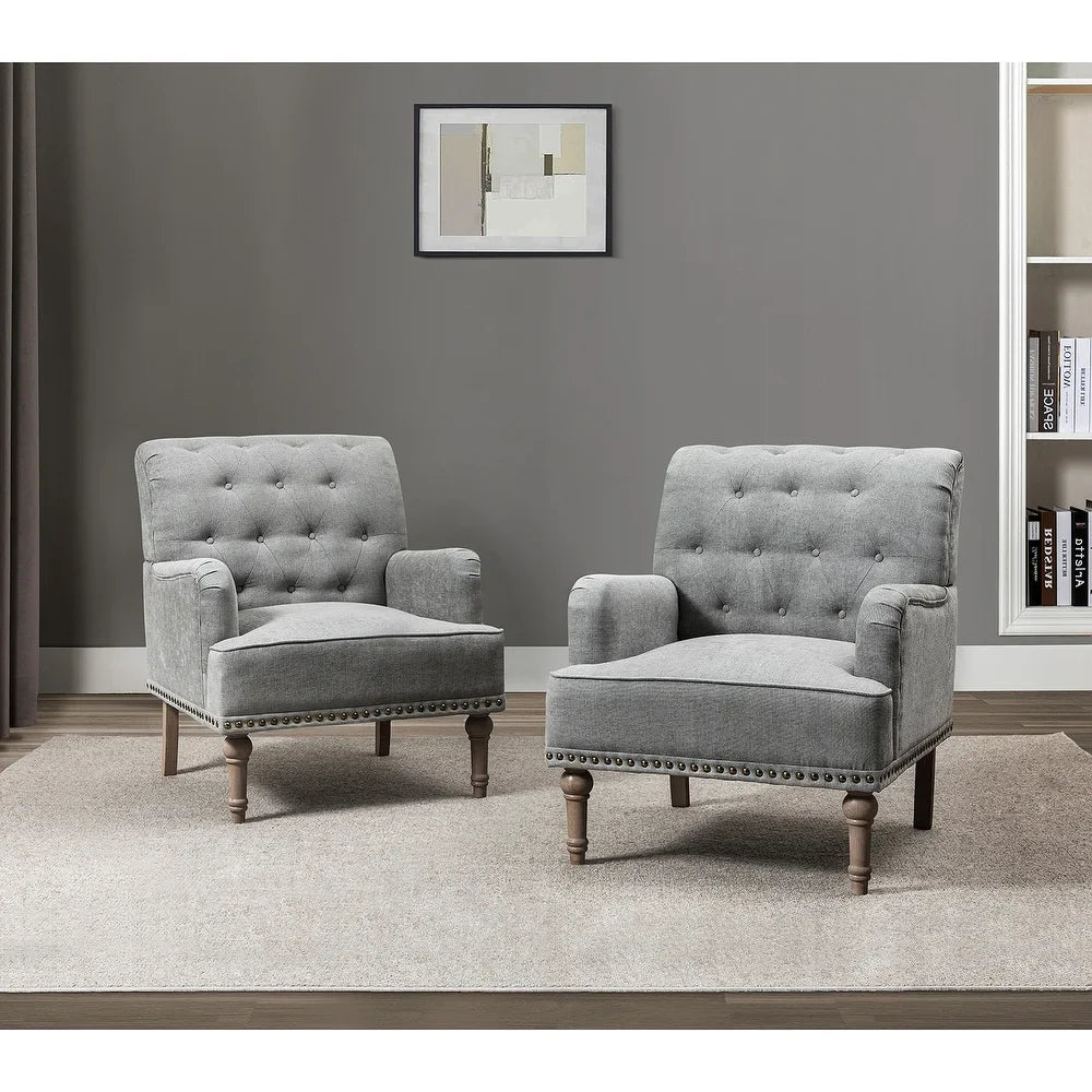 Any seating ensemble gets instantly more stylish when you add in this alluring armchair set. Incorporating the classic traditional style effortlessly in a gentle appeal, this design with attention paid button-tufted backrest, and a roomy seat that is rounded out by the delicate nailhead trim brings unforgettable enjoyment. Foam padding and s-spring lend comfort to the piece, while solid-hued polyester upholstery wrapping boasts fashions thanks to the tasteful recessed arms. Perched on beautifully carved solid wood legs showing a hint of farmhouse charm, this accent chair set including two single chairs will definitely bring your living space the sophistication that you are looking for.