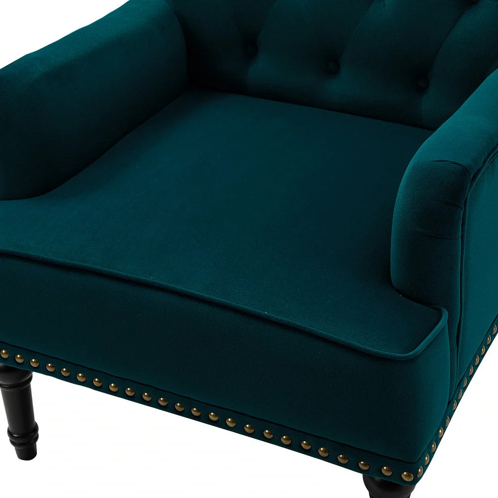 Add a touch of glamour to your living room or bedroom with the Esther Comfy Upholstered Button Tufted Arm Accent Chair. With its classic and contemporary style, this chair is designed to catch the eye. The premium velvet fabric, elaborately carved rubberwood legs, and nailhead trim exude luxury and elegance. The S-spring built-in seat rest and medium-density foam filling provide maximum comfort, while the solid and manufactured wood frame ensures durability. The timeless design of this accent chair will complement any home decor with its rich color selections. Perfect for relaxing with a good book or your favorite show, this chair is an essential addition to your living space.