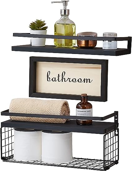 - Farmhouse Style Bathroom Wall Accessories 3 sets - Farmhouse Style Combo - Farmhouse Style Black Bathroom Wall Accessories 3 sets including: Wall Bathroom signs and Floating ledges with Guardrail and Floating ledges with basket. Store your bathroom, but not just storage. Let's make your bathroom cute and rustic. Add fun to your bathroom with a bathroom decorating kit!
