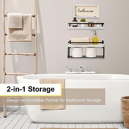 - 2 in 1 Floating Shelf with Toilet Paper Basket - The floating shelf basket in the bathroom can store 3 rolls of toilet paper, other small items and towels. Our floating bathroom shelf storage baskets are coated with powder for greater durability and rust resistance. It is suitable for wet environment. These wall-mounted floating shelves come with a mesh design that reduces dust buildup and keeps toilet paper clean and dry.