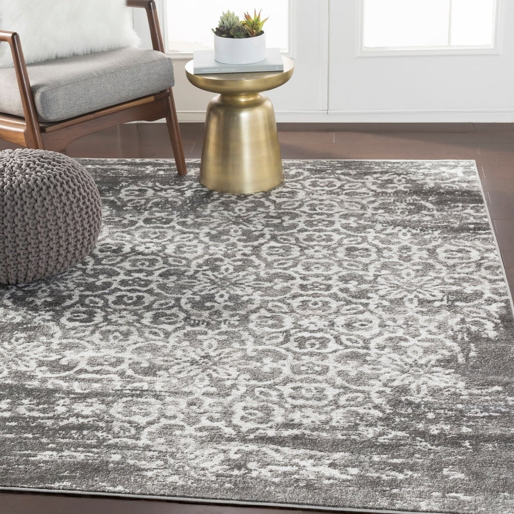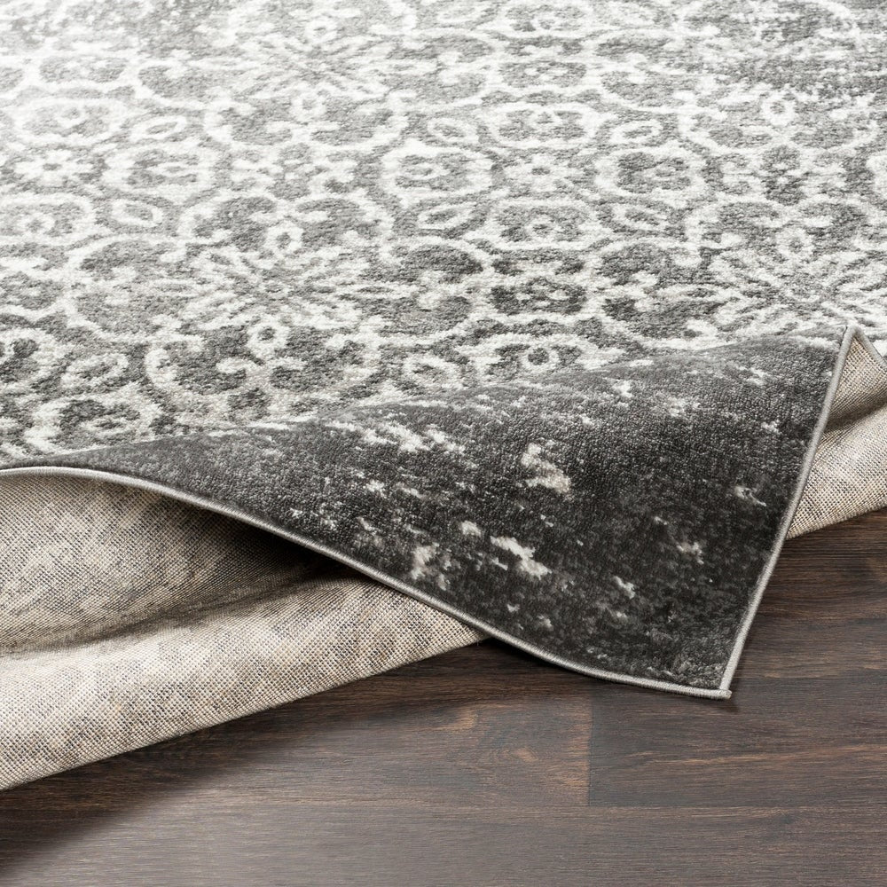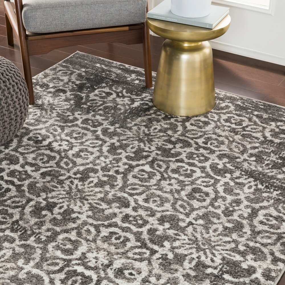 This lovely collection features a distressed floral damask pattern in a beautiful blend of Charcoal, Light Gray and White. Gorgeous and soft, this rug features a comfortable pile with minimal shedding. Great for high-traffic areas. Machine made in Turkey with 100% polypropylene. Spot or professionally clean only. Rug pad recommended.