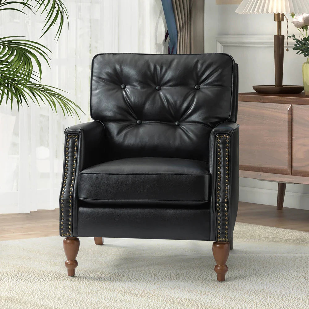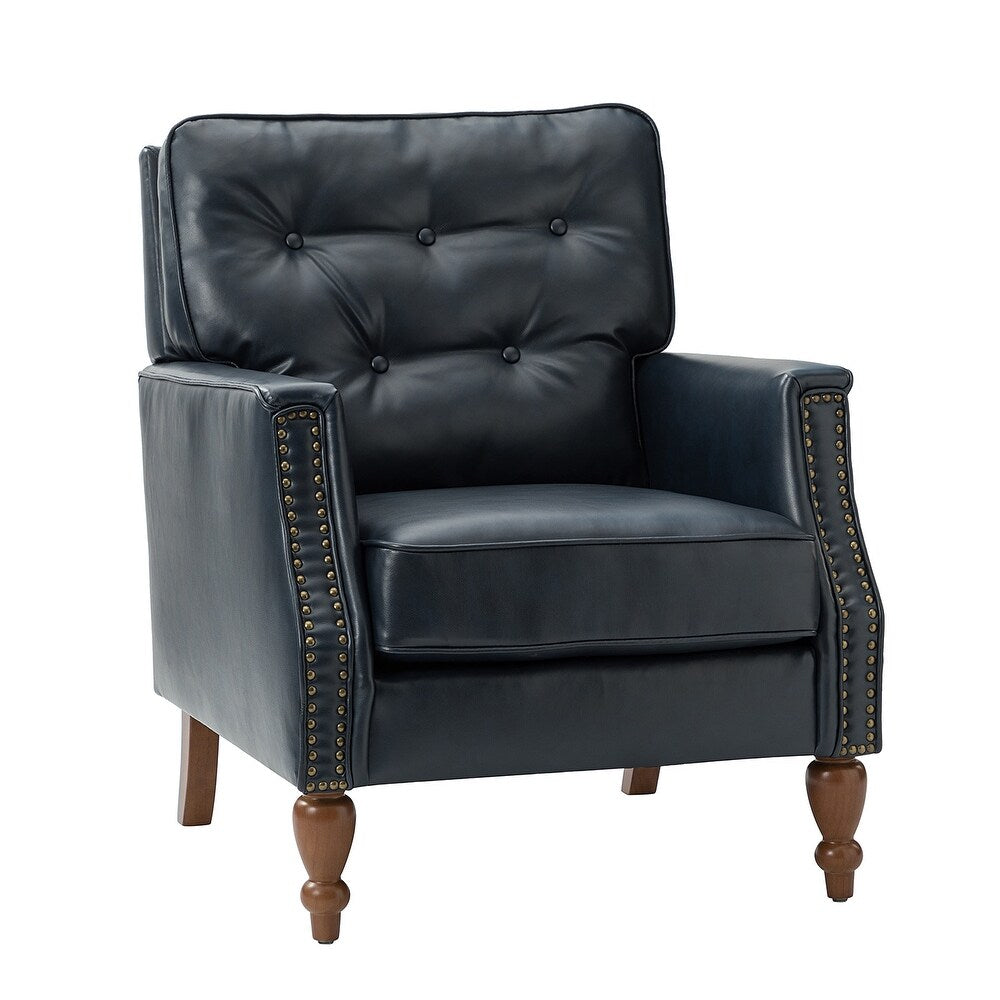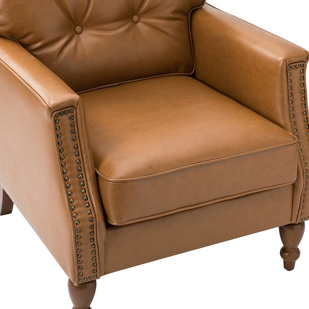 - Attractive Accent: This armchair has a tufted back with button pull points for a regal look. The stud accents on the bottom of the seat complement the hand-carved wooden legs, adding to the elegance of this chair.